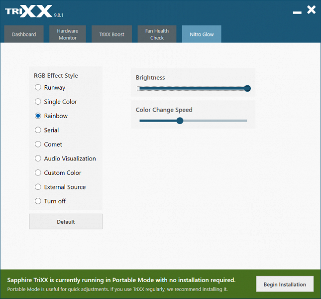 Управление режимами подсветки, в том числе и ее отключением, осуществляется той же утилитой Sapphire Trixx. Работа подсветки может быть синхронизирована с любыми материнскими платами, имеющими разъемы ARGB 5 В. Для этого надо прилагаемый в комплекте поставки кабель ARGB подключить к соответствующему разъему на карте (около разъема питания) и в настройках утилиты Sapphire Trixx выбрать External Source.
