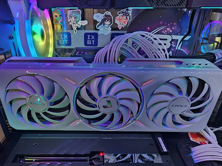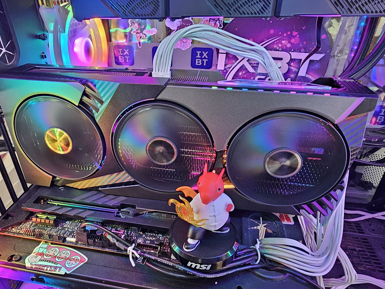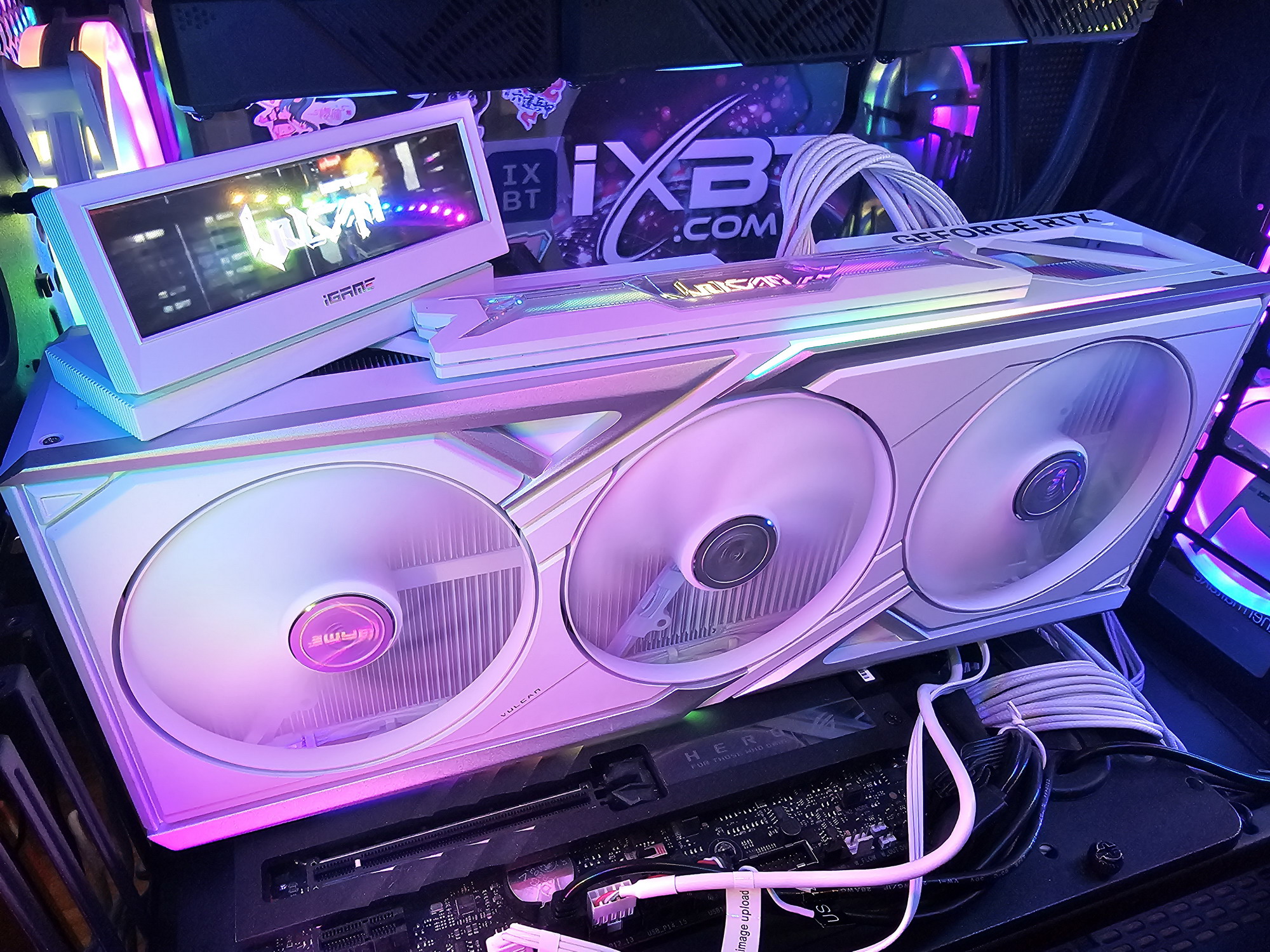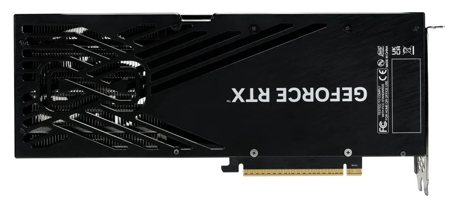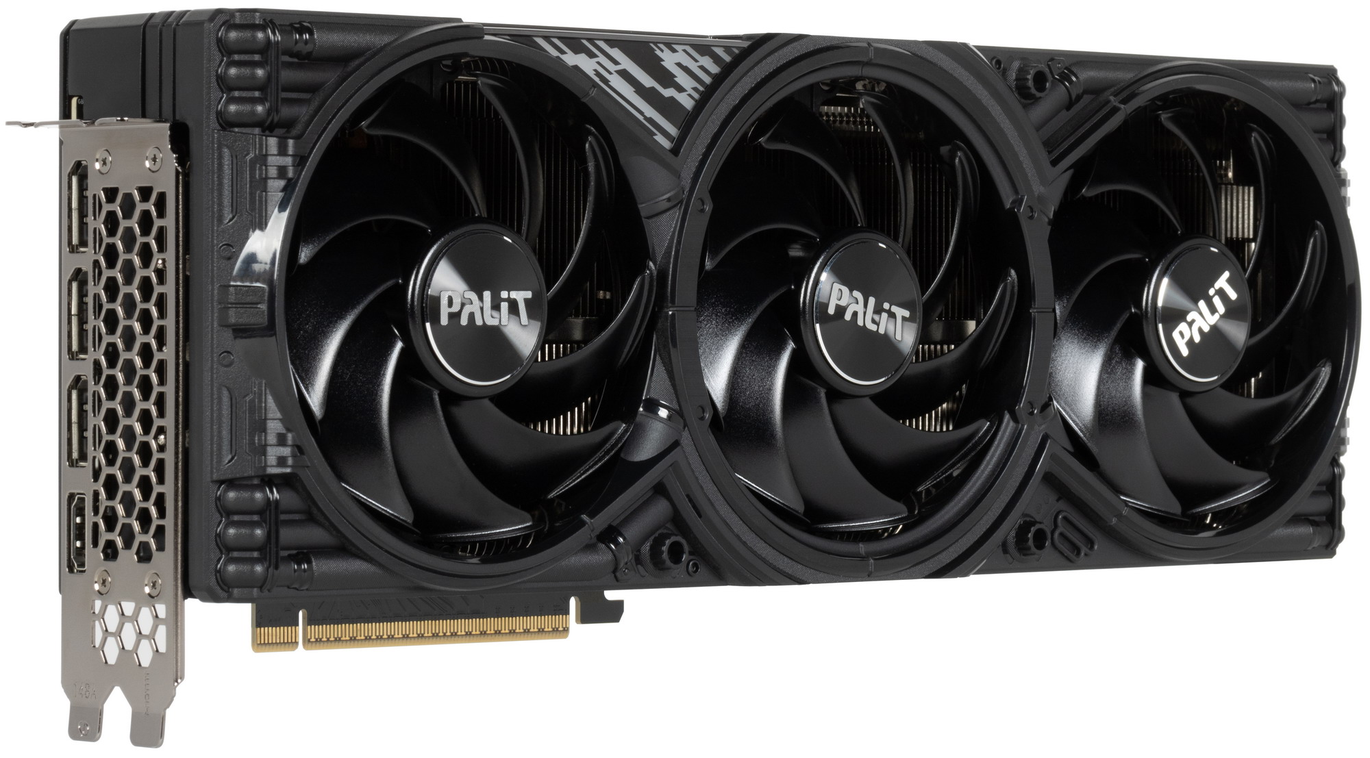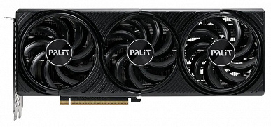 Выбранная нами карта Palit имеет стандартные размеры 33×13 см, занимая 3 слота в системном блоке. Использованный кулер сравнительно тихий, карта может потреблять до 250 Вт (при ручном разгоне — до 300 Вт) и имеет один 16-контактный разъем питания 12VHPWR (PCIe 5.0). У карты 4 видеовыхода: 1 HDMI 2.1b и 3 DisplayPort 2.1b.