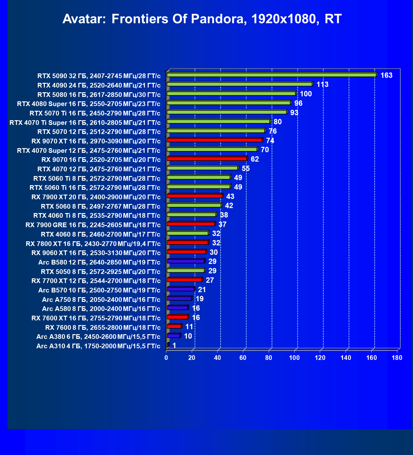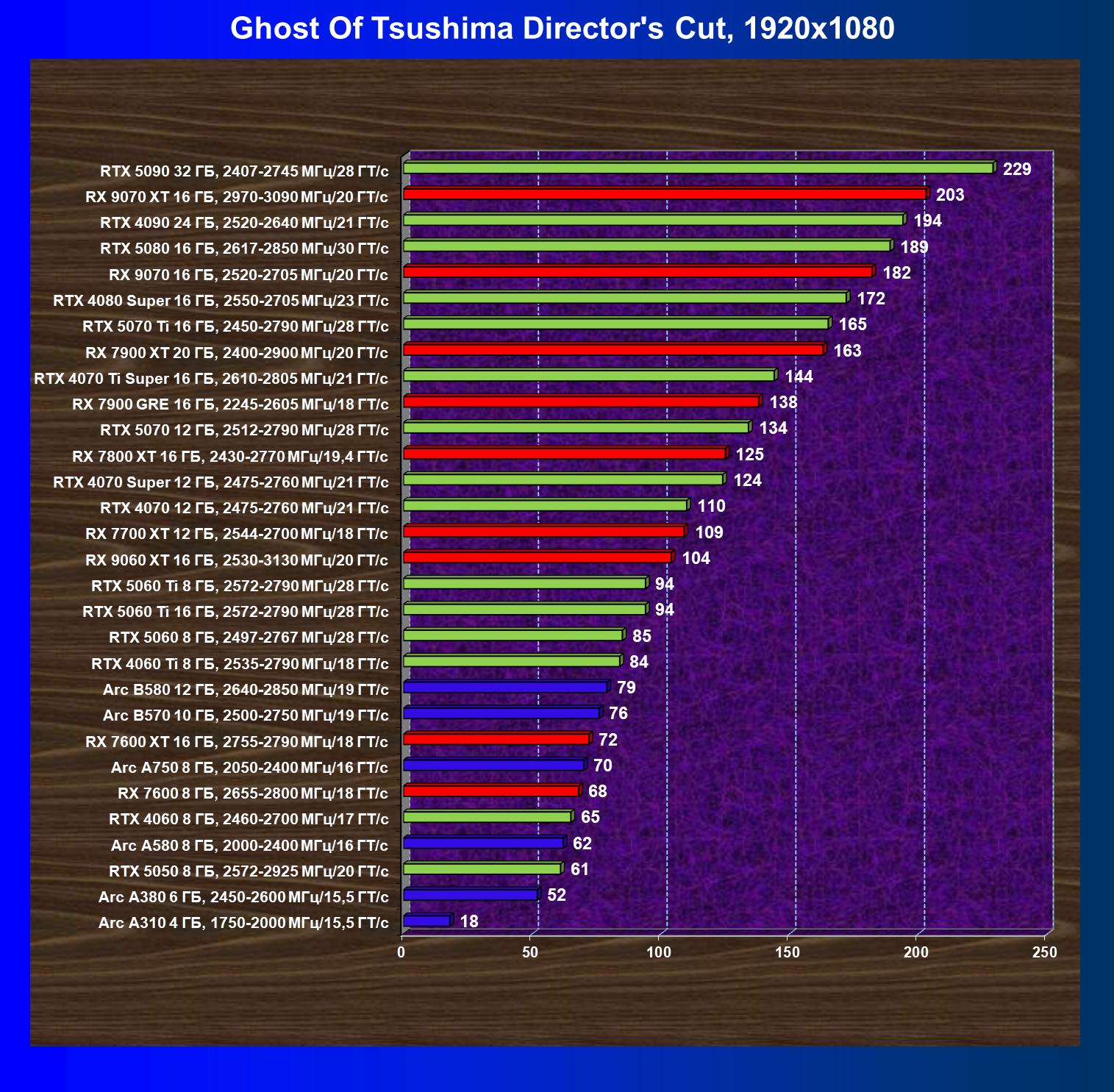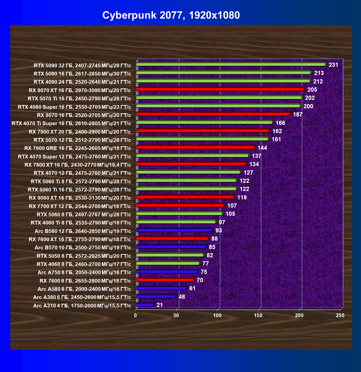 В разрешении Full HD достойно себя показывают Arc A750, Arc B570, GeForce RTX 5050, а также все более производительные решения. В ряде случаев в очень сложных по графике играх придется подбирать ускорители на уровень выше (либо понижать настройки графики).