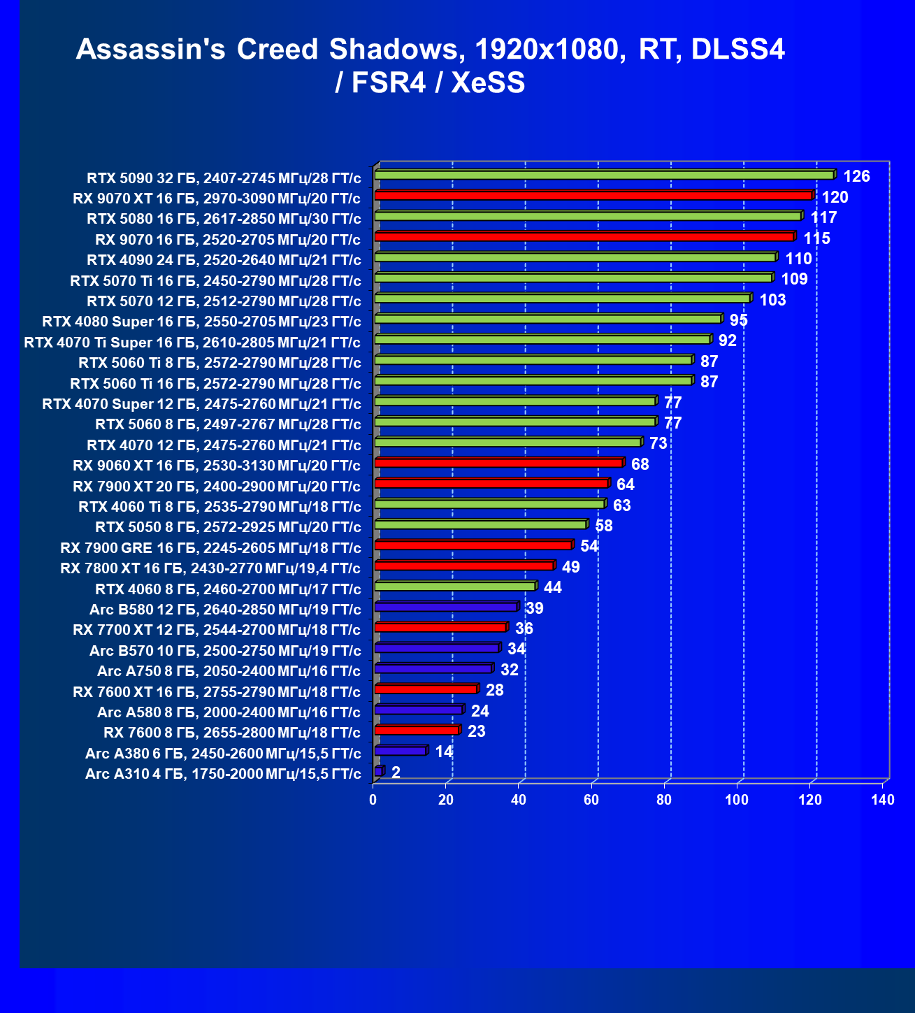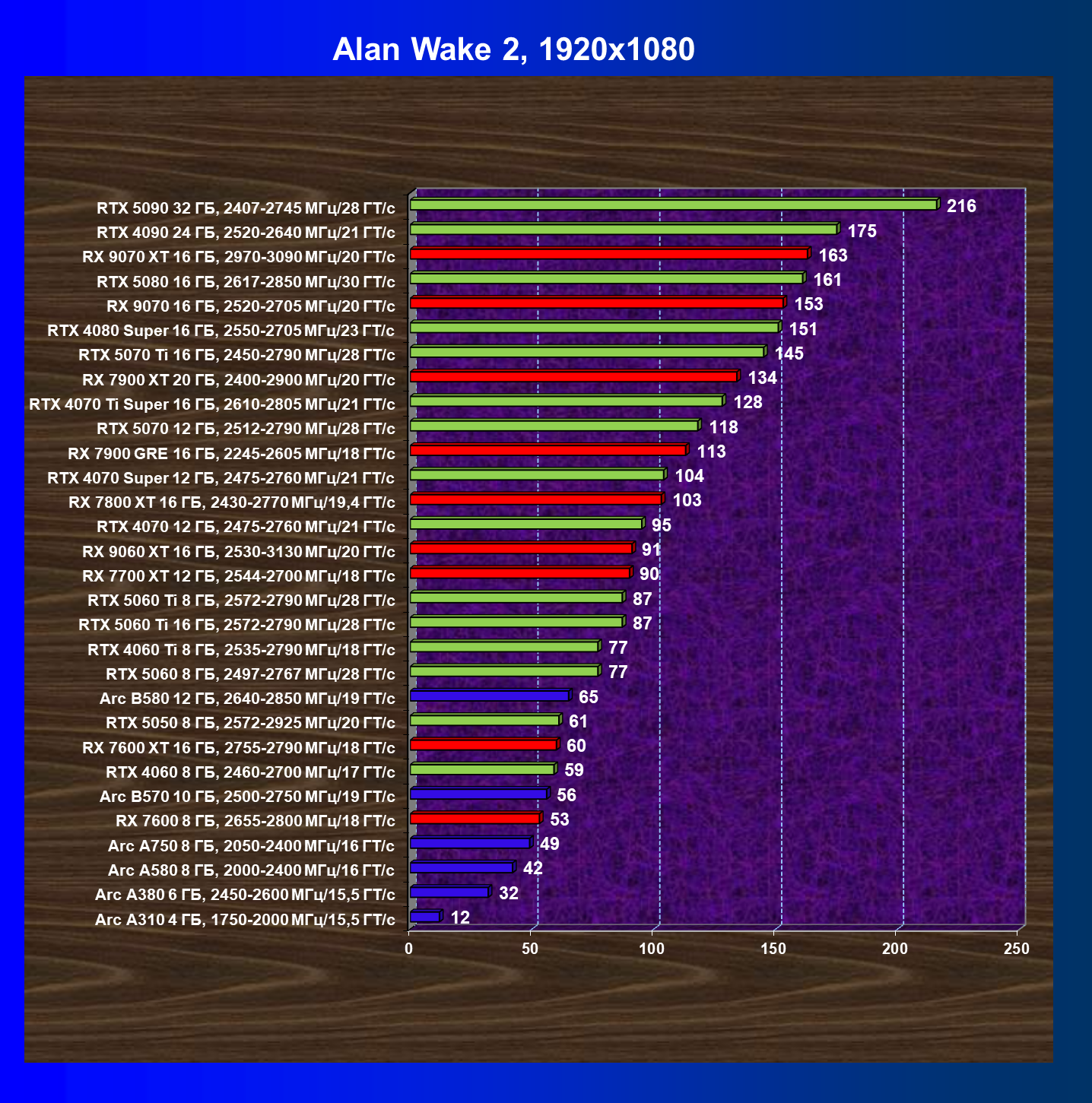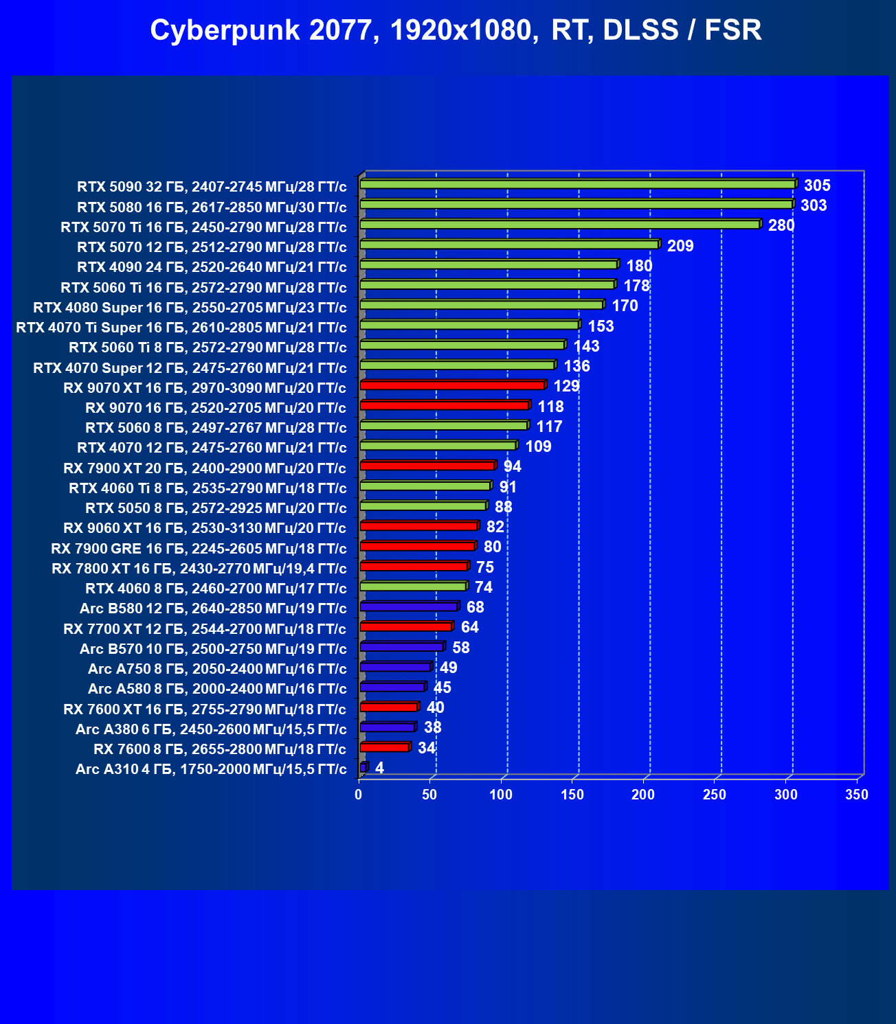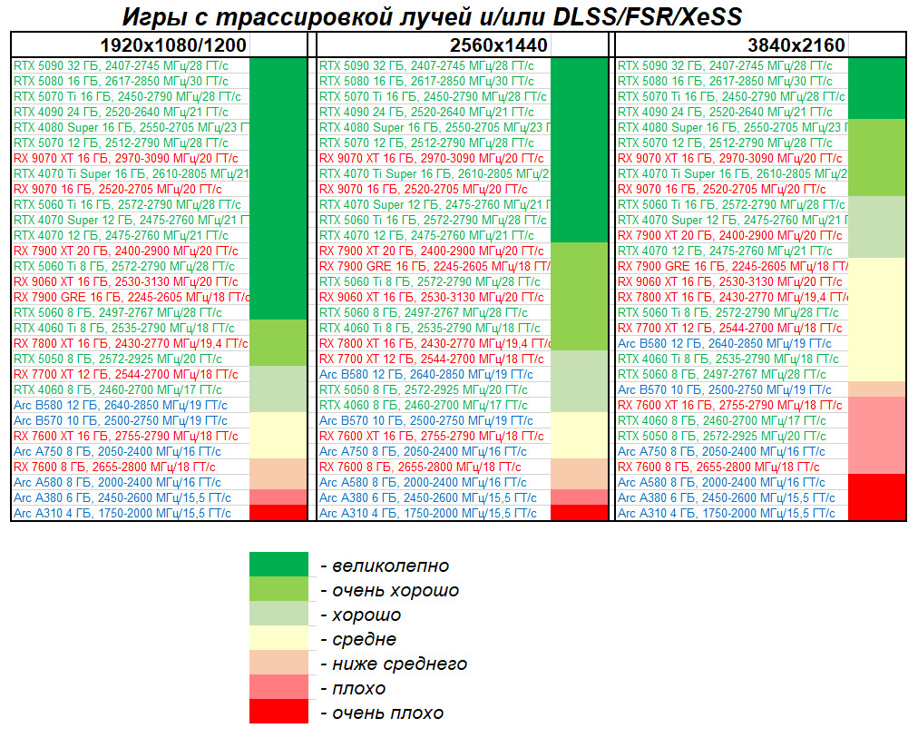 Все упомянутые видеокарты подойдут и для игр на мониторах с более массовым разрешением Full HD. При включении трассировки лучей совместно с DLSS, FSR или XeSS полный комфорт обеспечивают карты уровня Radeon RX 7700 XT, GeForce RTX 4060, Arc B580, а также GeForce RTX 5060 и GeForce RTX 5050 (только при использовании DLSS 4).