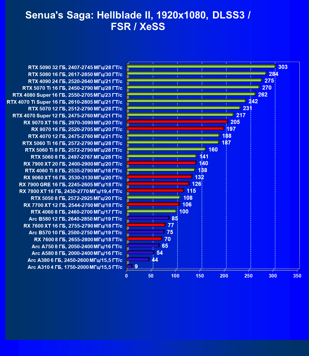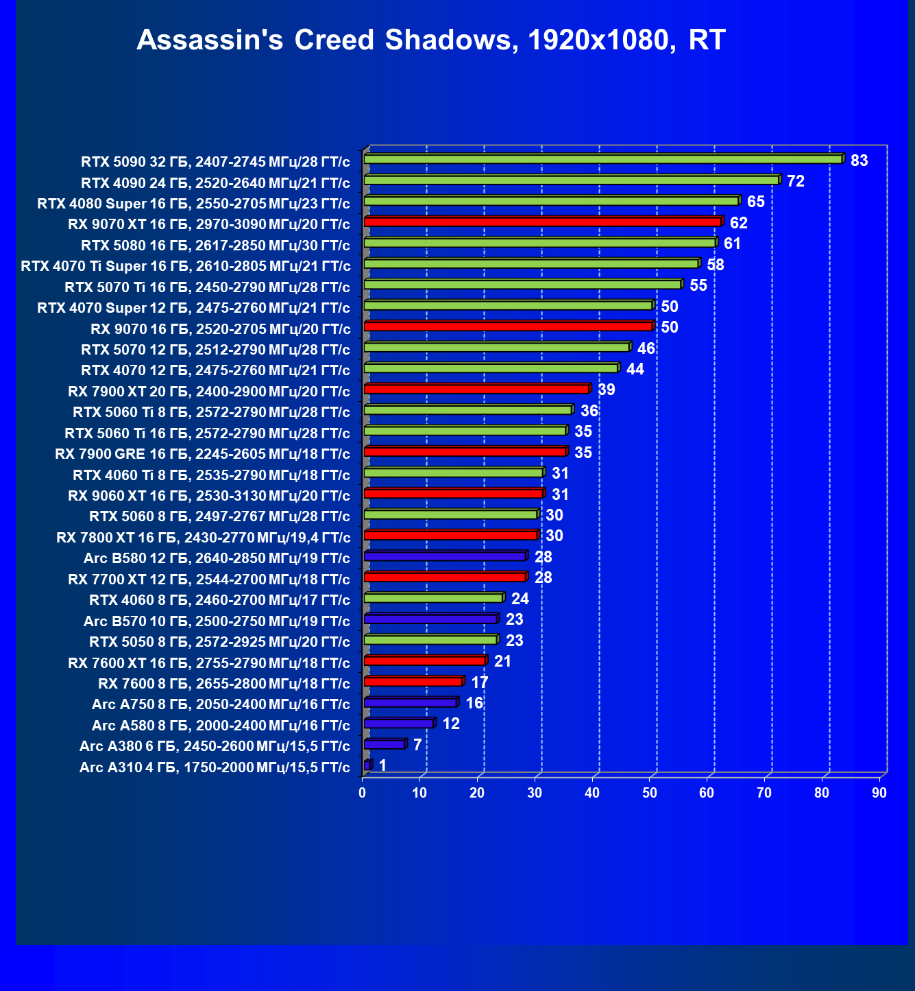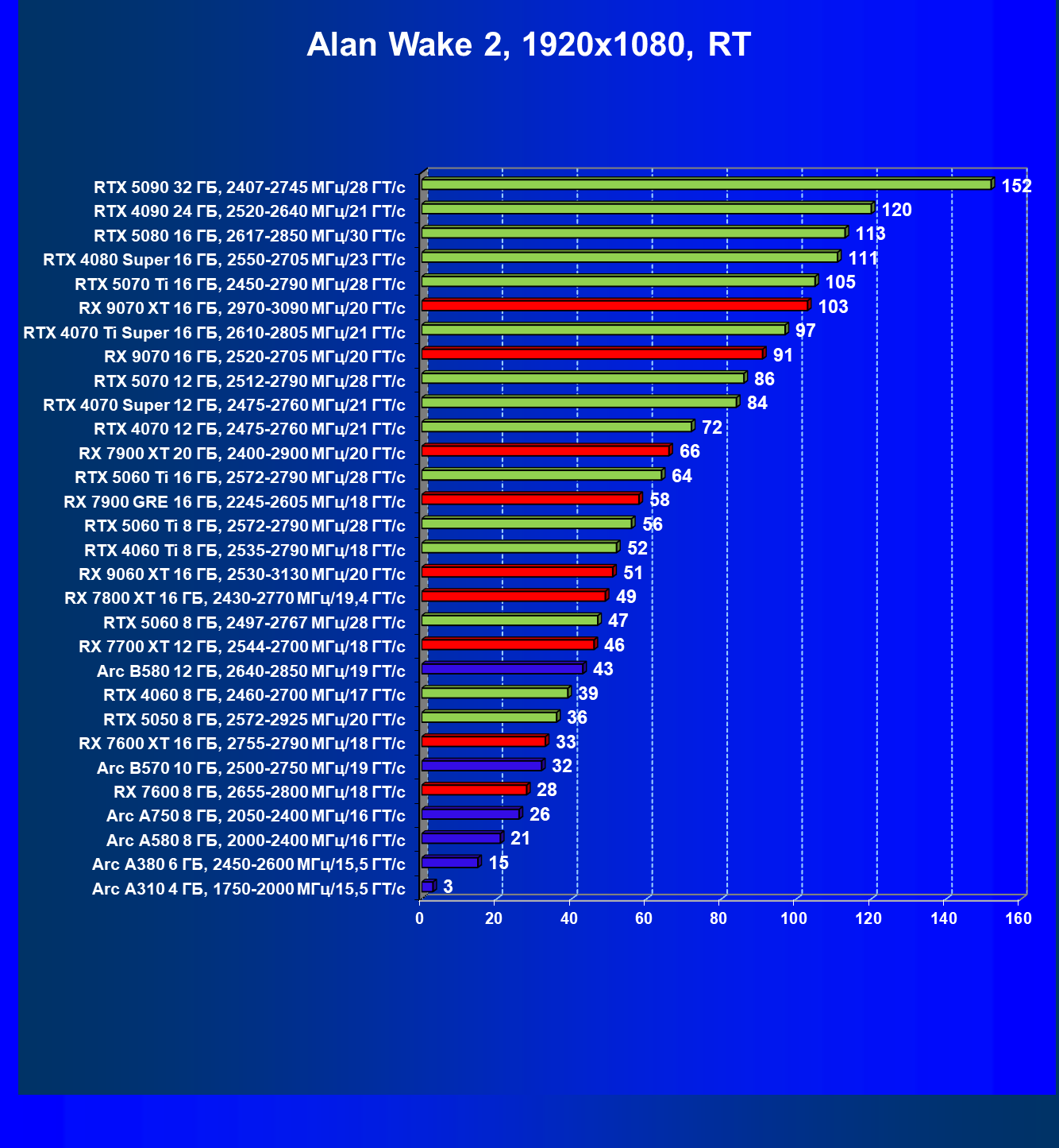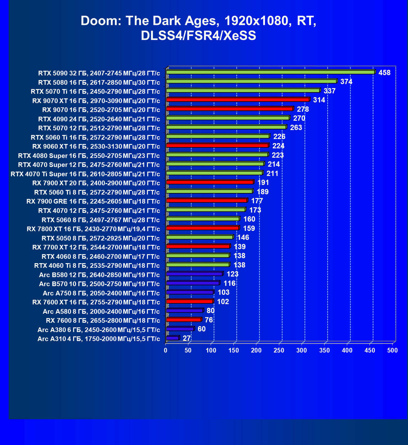 Все упомянутые видеокарты подойдут и для игр на мониторах с более массовым разрешением Full HD. При включении трассировки лучей совместно с DLSS, FSR или XeSS полный комфорт обеспечивают карты уровня Radeon RX 7700 XT, GeForce RTX 4060, Arc B580, а также GeForce RTX 5060 и GeForce RTX 5050 (только при использовании DLSS 4).