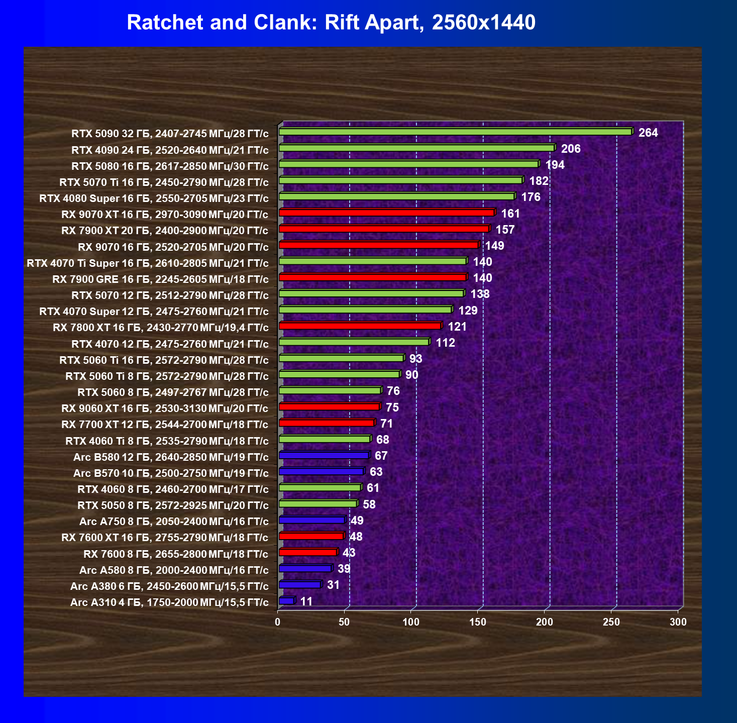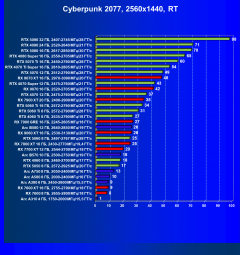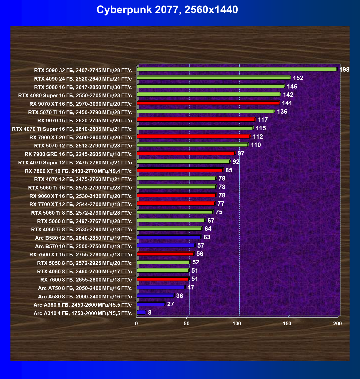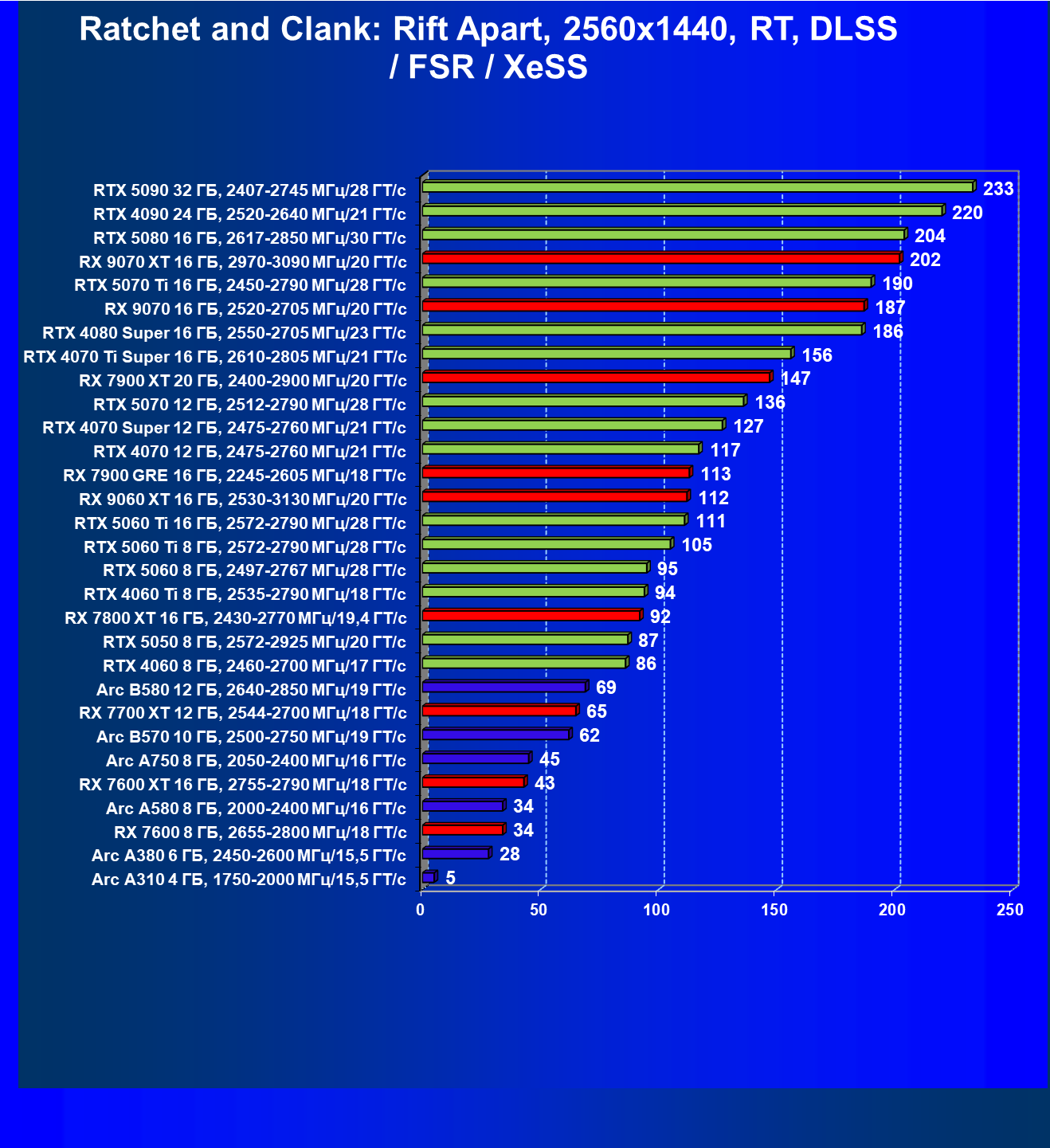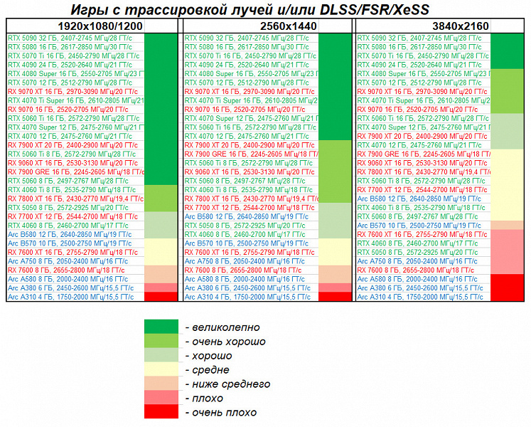Для игр с RT в этом разрешении потребуются GeForce RTX 4070, GeForce RTX 5060 Ti, GeForce RTX 4060 Ti или Radeon RX 7800 XT (или более производительные карты). Задействование FSR/XeSS совместно с RT позволит поиграть в 2.5K с помощью Arc B580, Radeon RX 7700 XT, Radeon RX 9060 XT и некоторых близких к ним ускорителей, но далеко не во все игры.