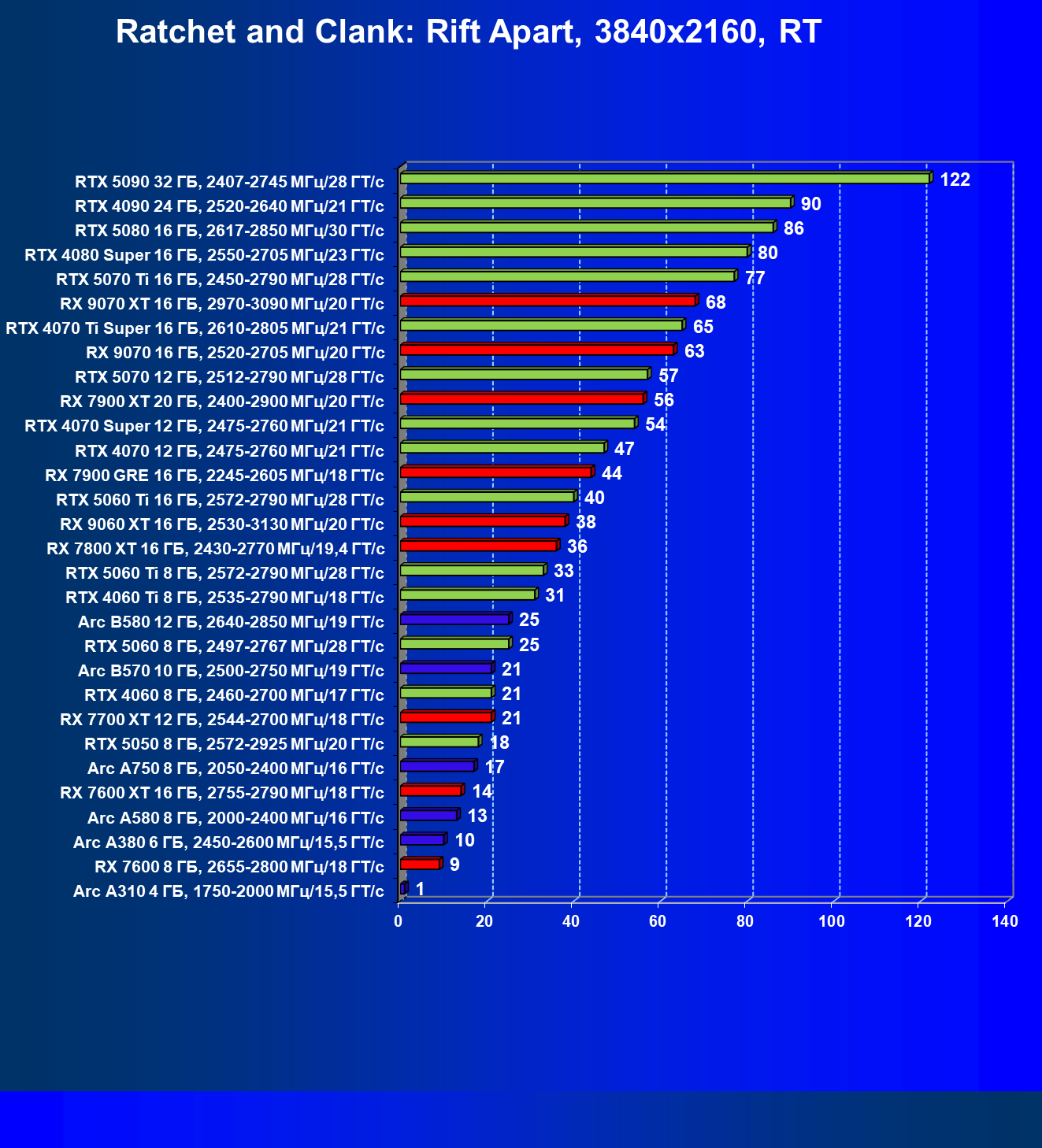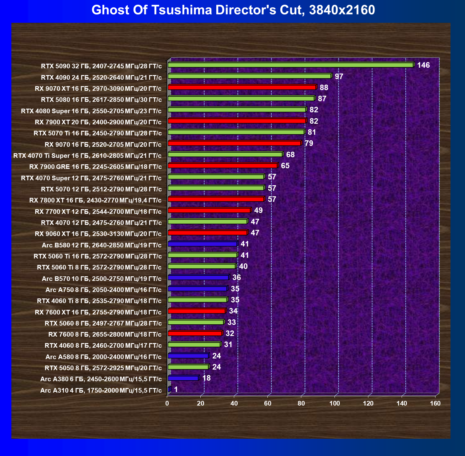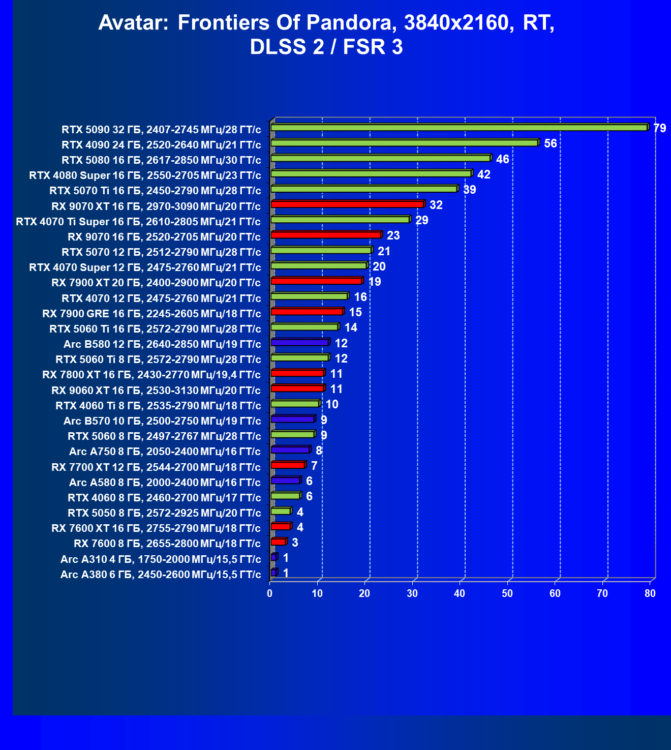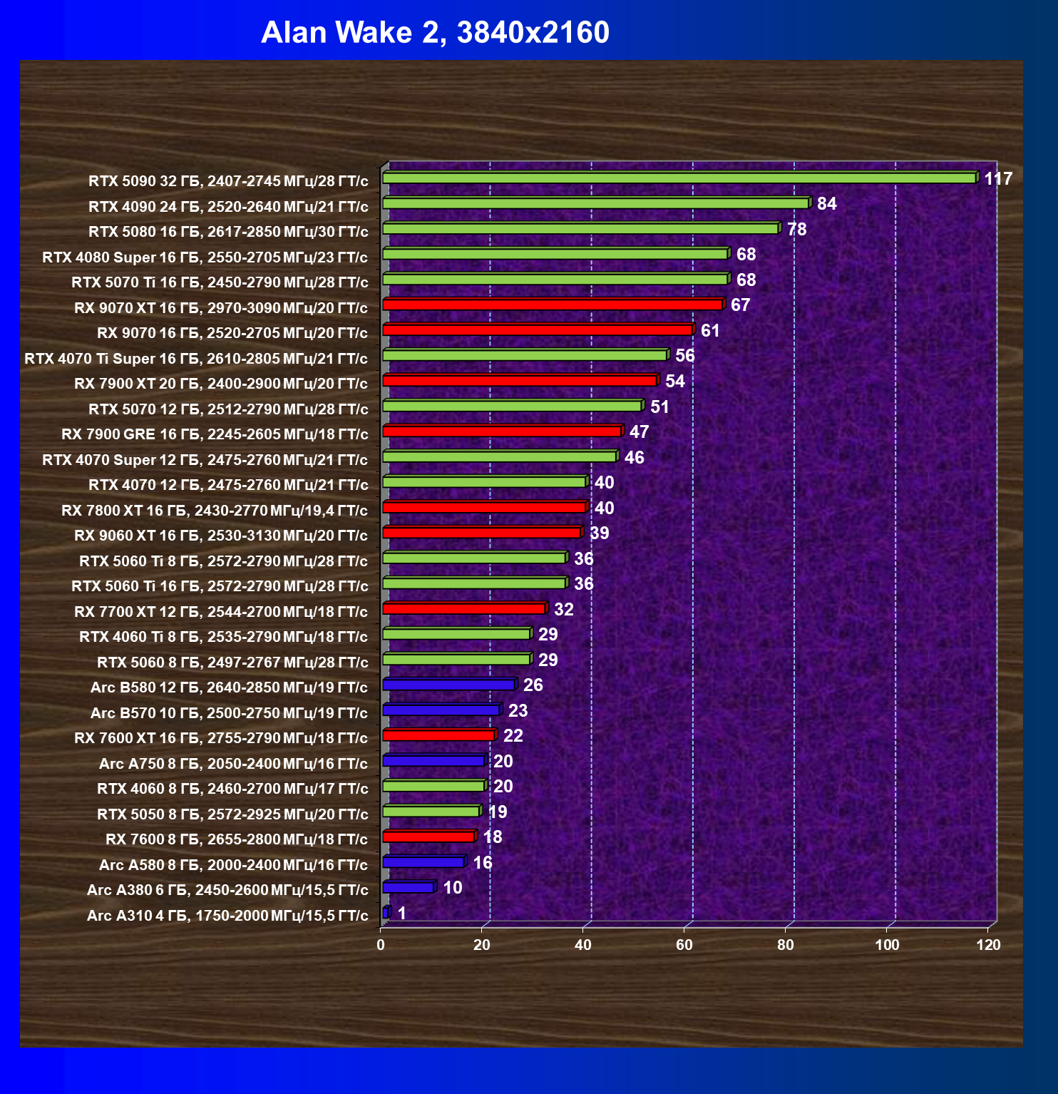 GeForce RTX 5090, GeForce RTX 5080, GeForce RTX 4090, GeForce RTX 4080 Super, GeForce RTX 4080, GeForce RTX 4070 Ti Super и Radeon RX 9070 XT, в принципе, в каких-то играх осиливают даже разрешение 8K, но без оговорок — только GeForce RTX 5090, GeForce RTX 5080 и GeForce RTX 4090.