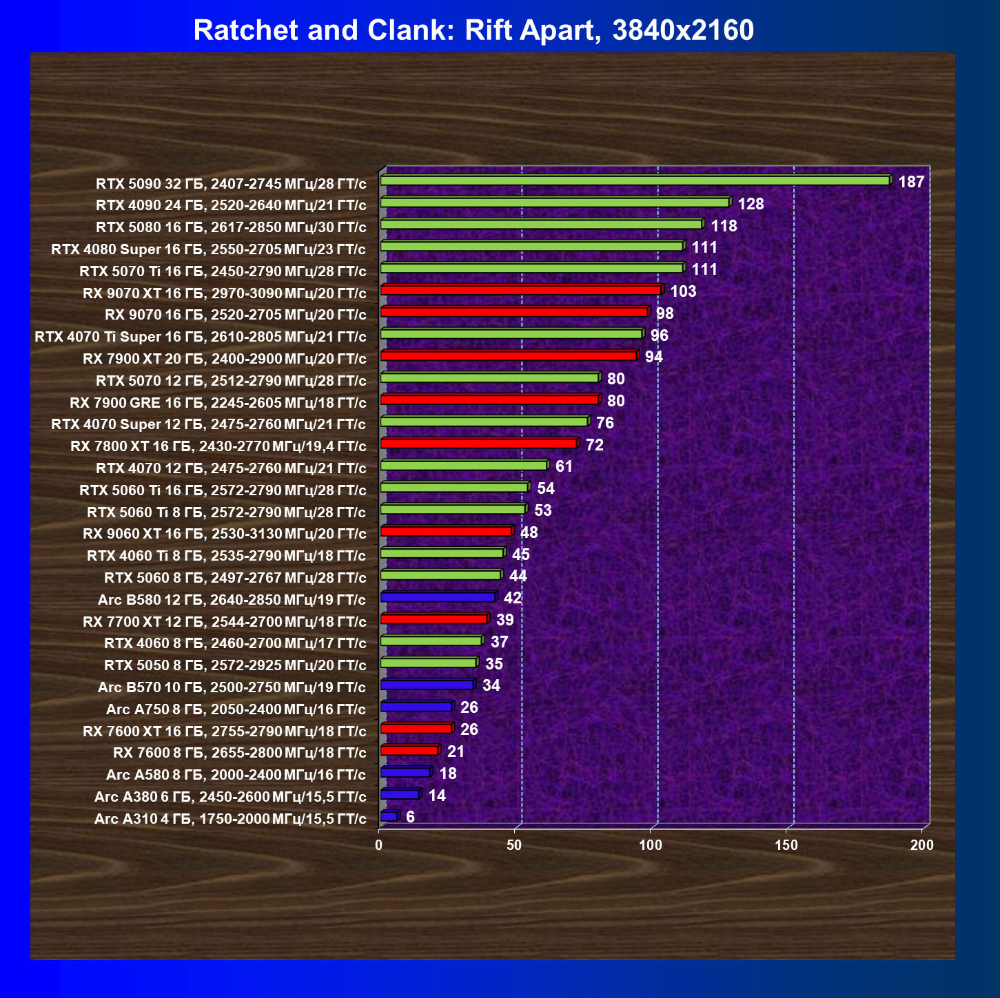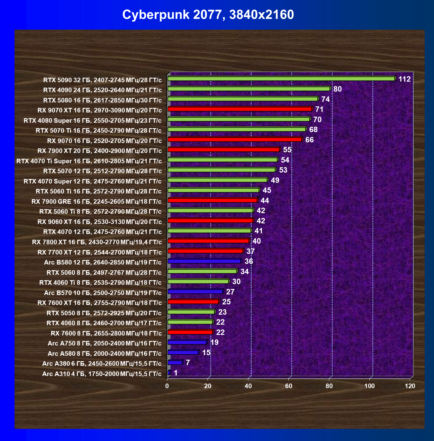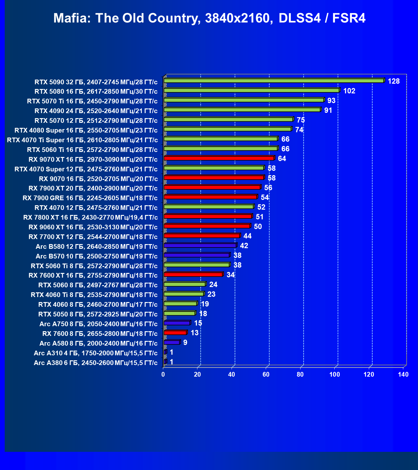 GeForce RTX 5090, GeForce RTX 5080, GeForce RTX 4090, GeForce RTX 4080 Super, GeForce RTX 4080, GeForce RTX 4070 Ti Super и Radeon RX 9070 XT, в принципе, в каких-то играх осиливают даже разрешение 8K, но без оговорок — только GeForce RTX 5090, GeForce RTX 5080 и GeForce RTX 4090.