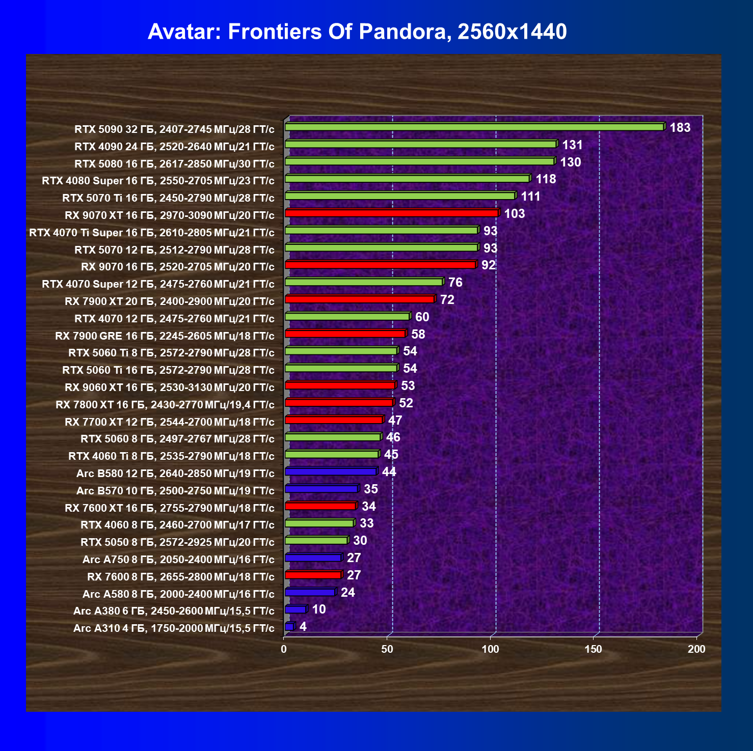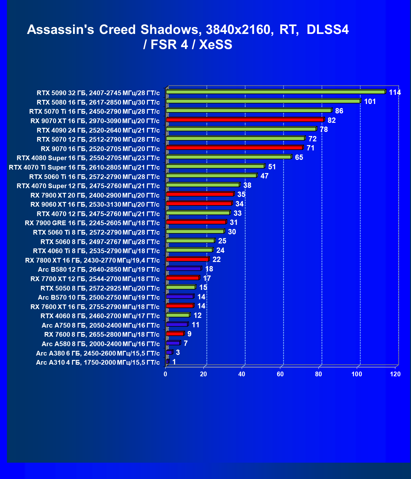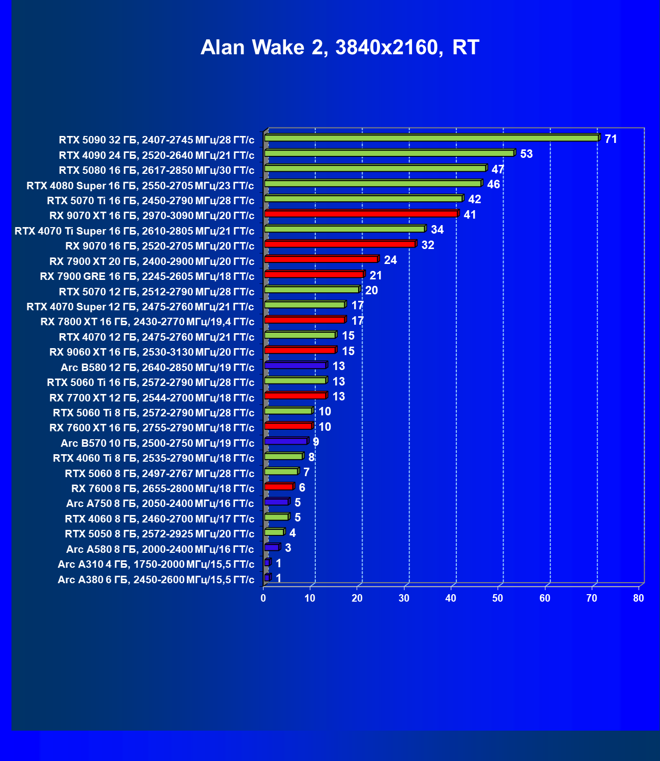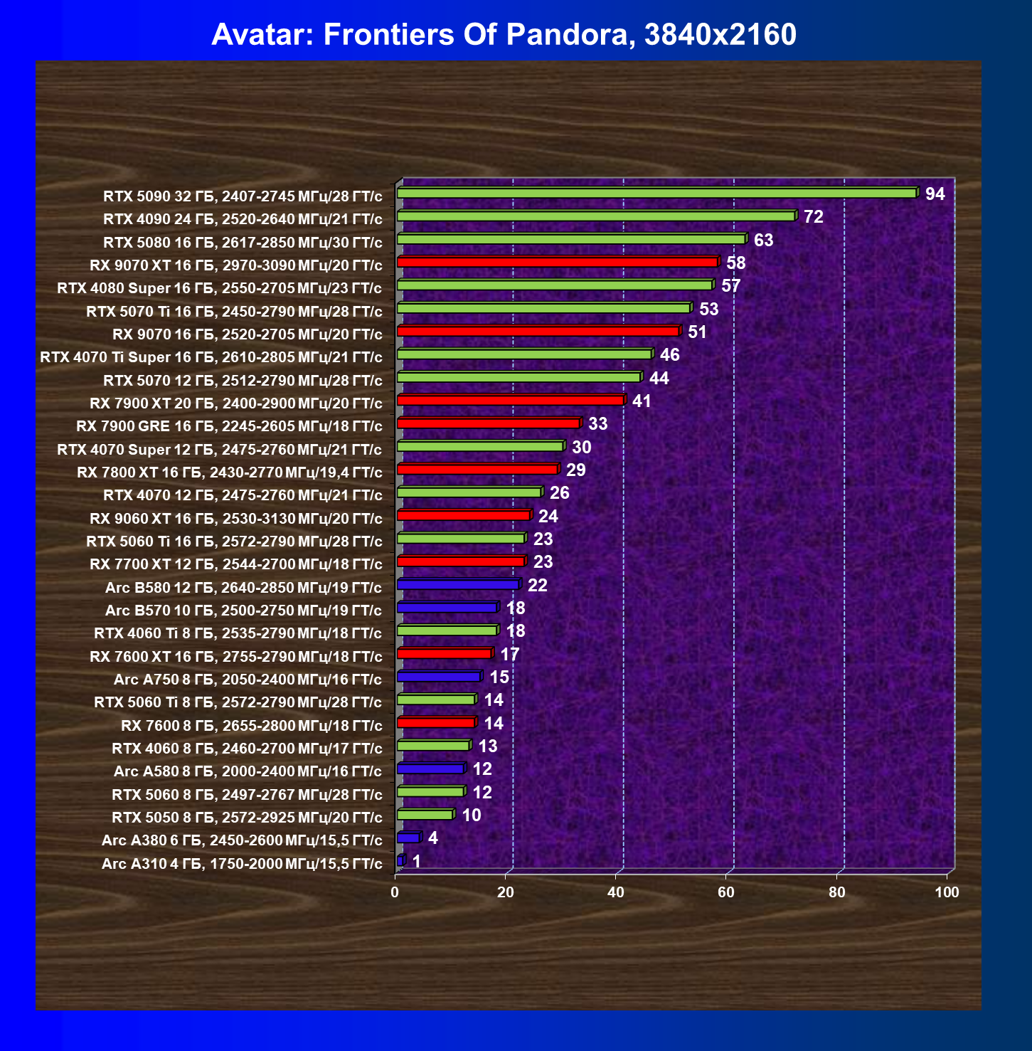 GeForce RTX 5090, GeForce RTX 5080, GeForce RTX 4090, GeForce RTX 4080 Super, GeForce RTX 4080, GeForce RTX 4070 Ti Super и Radeon RX 9070 XT, в принципе, в каких-то играх осиливают даже разрешение 8K, но без оговорок — только GeForce RTX 5090, GeForce RTX 5080 и GeForce RTX 4090.