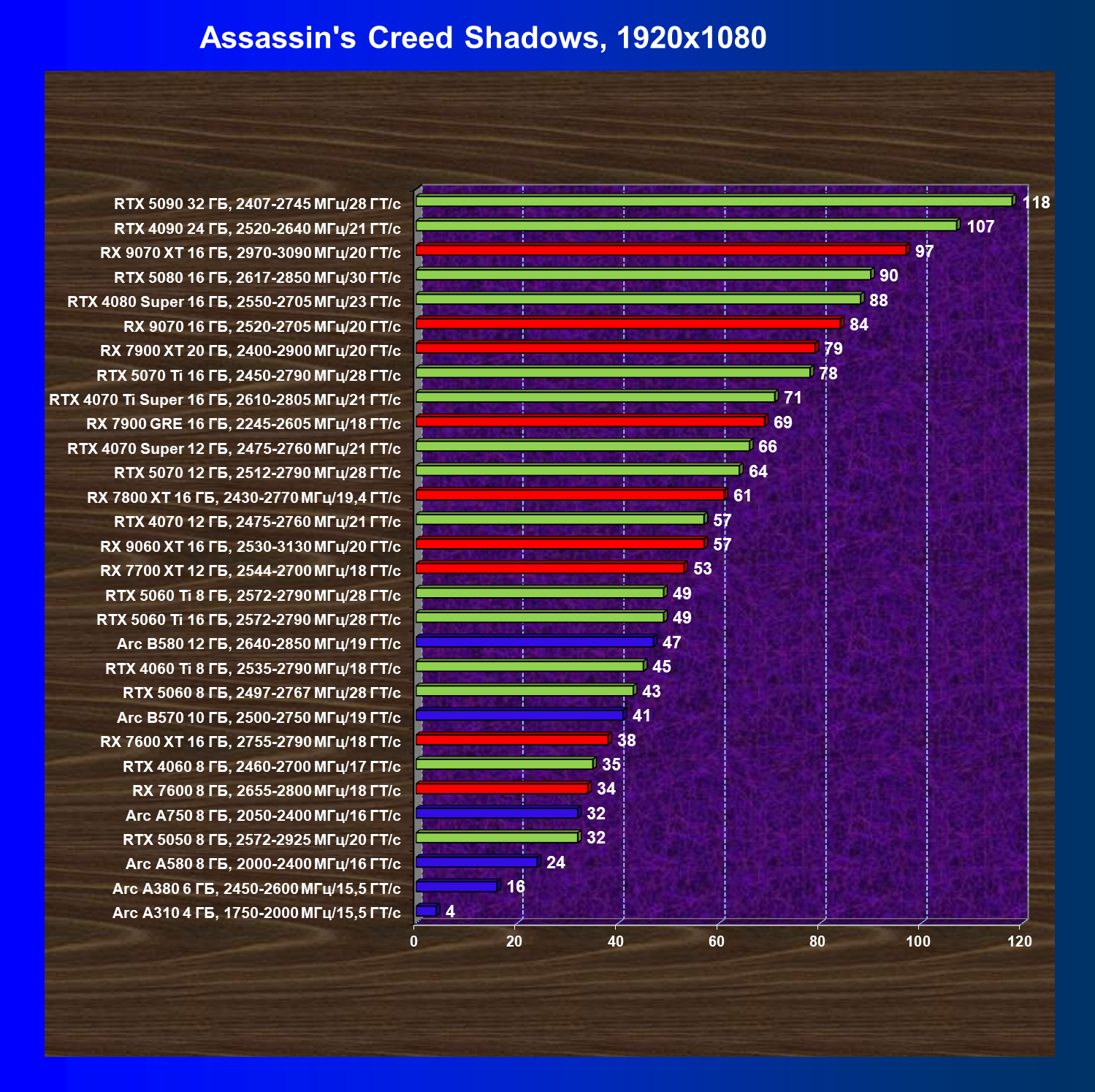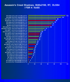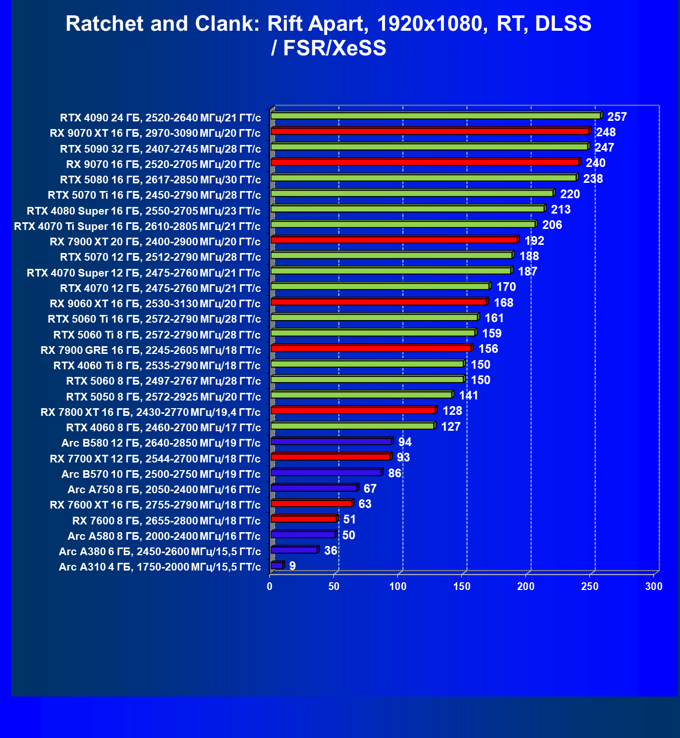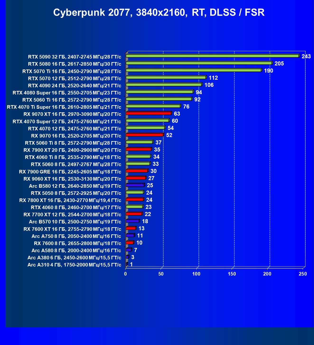 Менее производительные карты уровня GeForce RTX 5060 Ti, Arc B580, Radeon RX 7700 XT, Radeon RX 9060 XT (16 ГБ) демонстрируют в разрешении 4K приемлемый FPS не во всех играх даже без включения RT (но при максимальных настройках графики), и желательно будет включить DLSS/FSR/XeSS или снизить качество.
