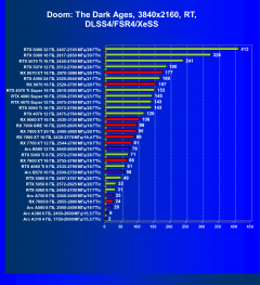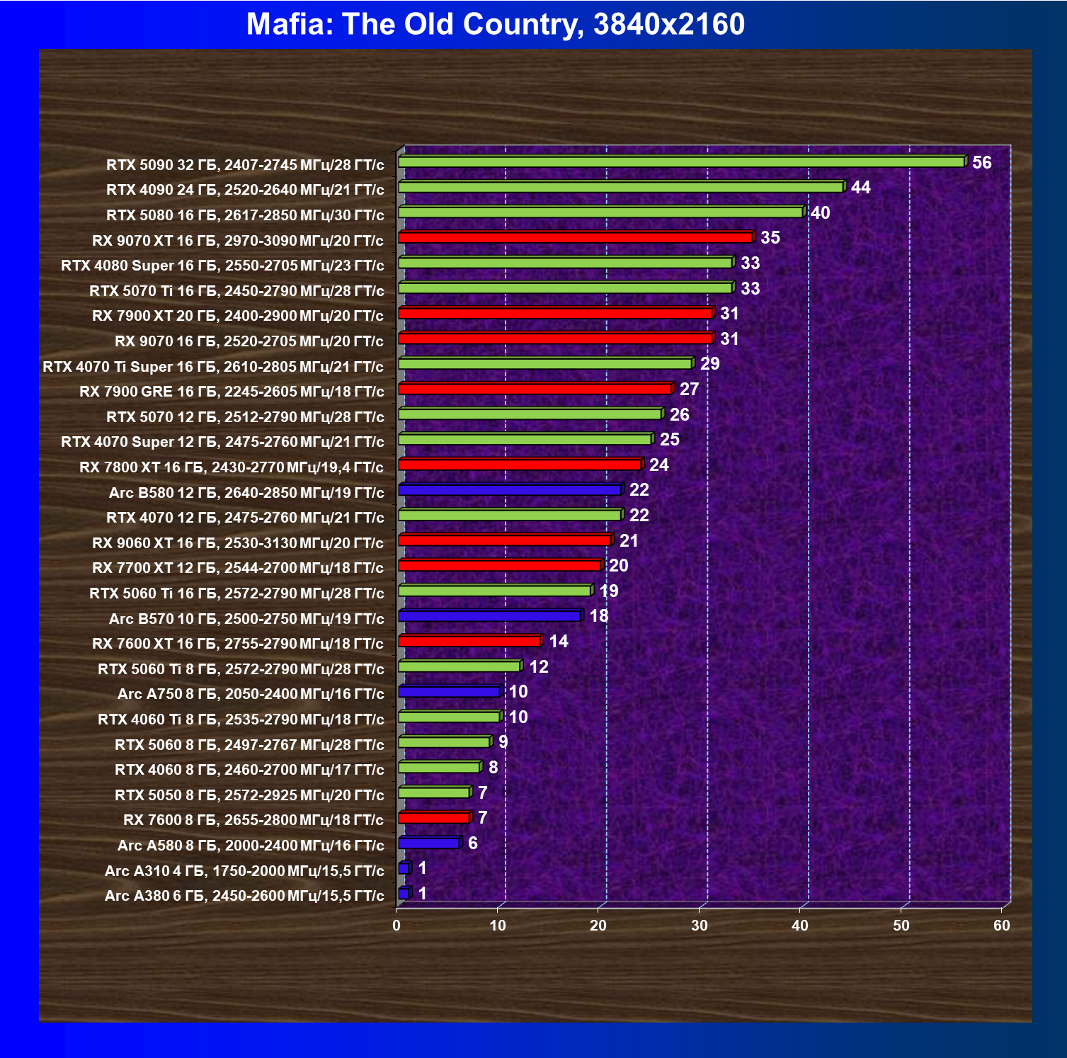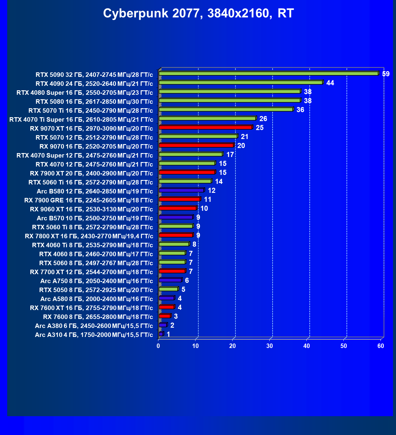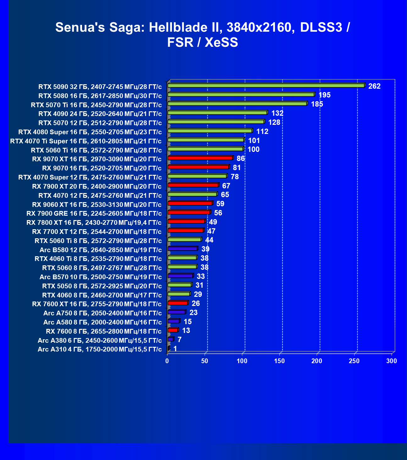 Менее производительные карты уровня GeForce RTX 5060 Ti, Arc B580, Radeon RX 7700 XT, Radeon RX 9060 XT (16 ГБ) демонстрируют в разрешении 4K приемлемый FPS не во всех играх даже без включения RT (но при максимальных настройках графики), и желательно будет включить DLSS/FSR/XeSS или снизить качество.