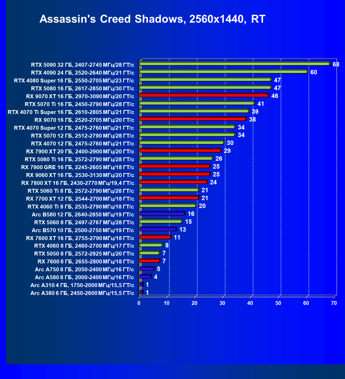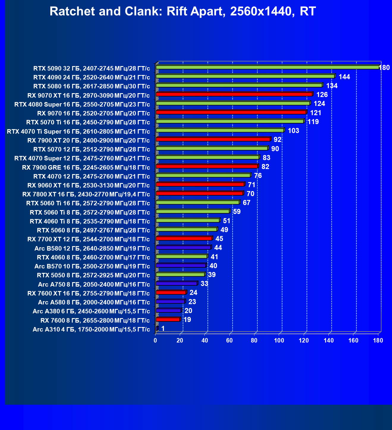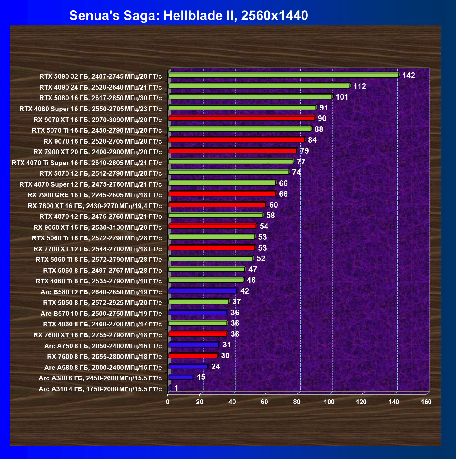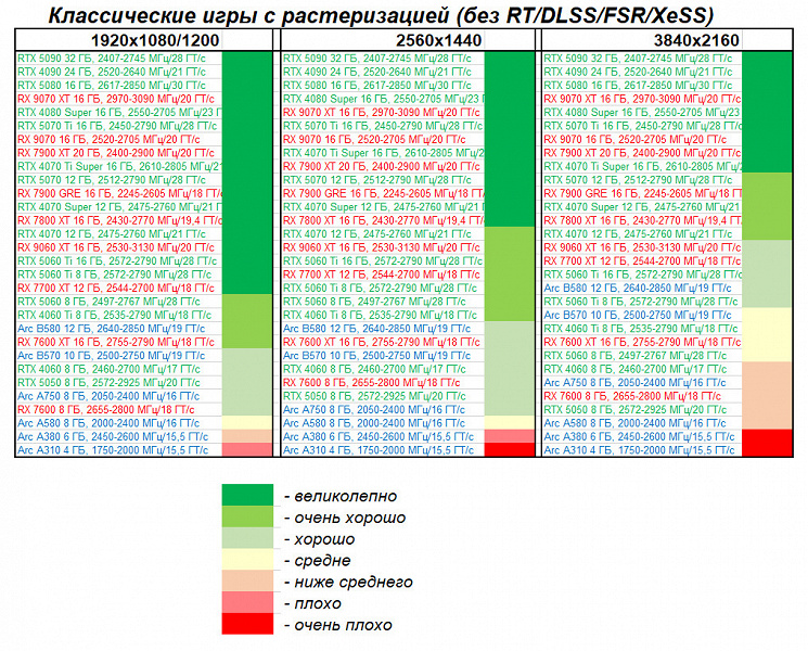 В рейтинге полезности для разрешения 2560×1440 в классических играх без RT лидером является ускоритель Arc B570 10 ГБ из-за достаточного объема памяти для такого разрешения и оптимальной цены. А вот в играх с RT и технологиями масштабирования самым выгодным является GeForce RTX 5070.