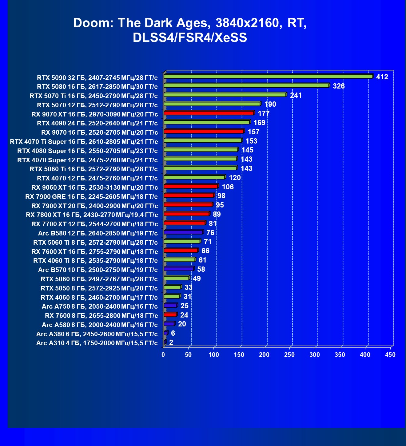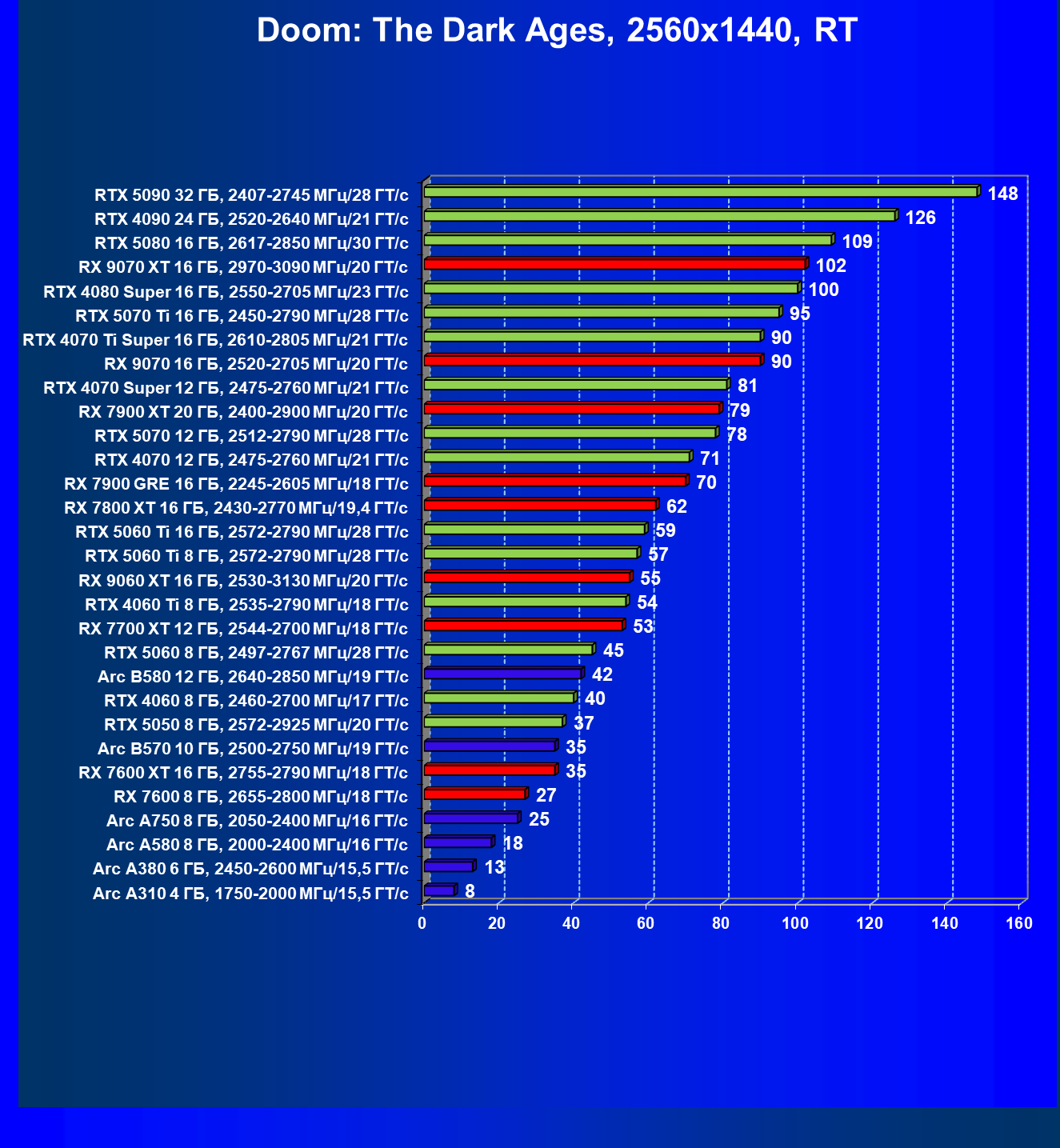 Во всех играх (кроме Doom: The Dark Ages - использовались настройки Ultra) использовалось максимальное качество графики в настройках (через пресеты/предустановки в играх).