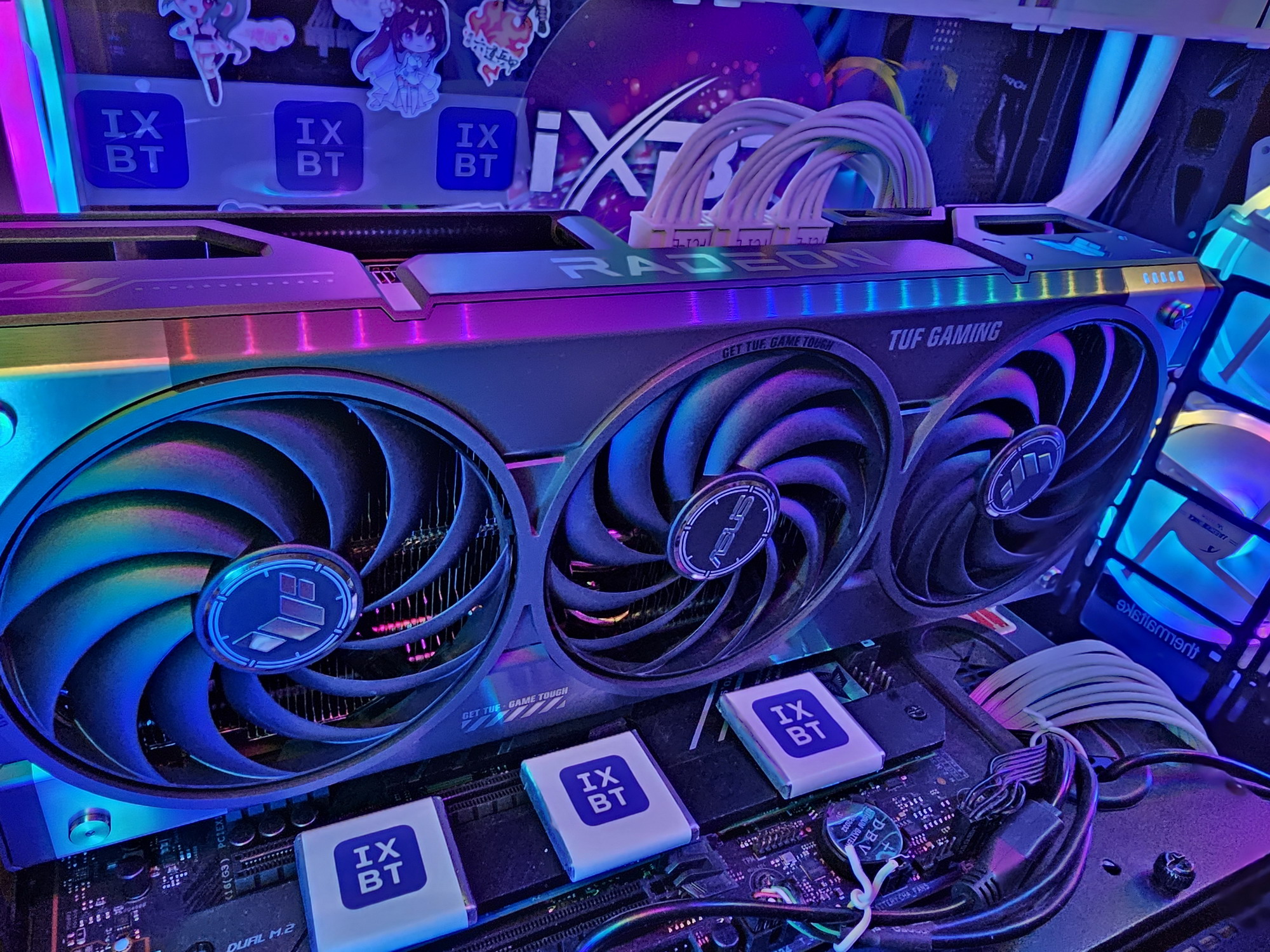Выбранная карта Asus Prime Radeon RX 9070 (16 ГБ) имеет типовые для решений такого уровня размеры 31×13 см, занимая 3 слота в системном блоке. Использованная СО очень тихая. Карта может потреблять до 230 Вт (официальный лимит AMD — 250 Вт) и имеет два 8-контактных разъема питания. У нее 4 видеовыхода: 1 HDMI 2.1b и 3 DisplayPort 2.1b.