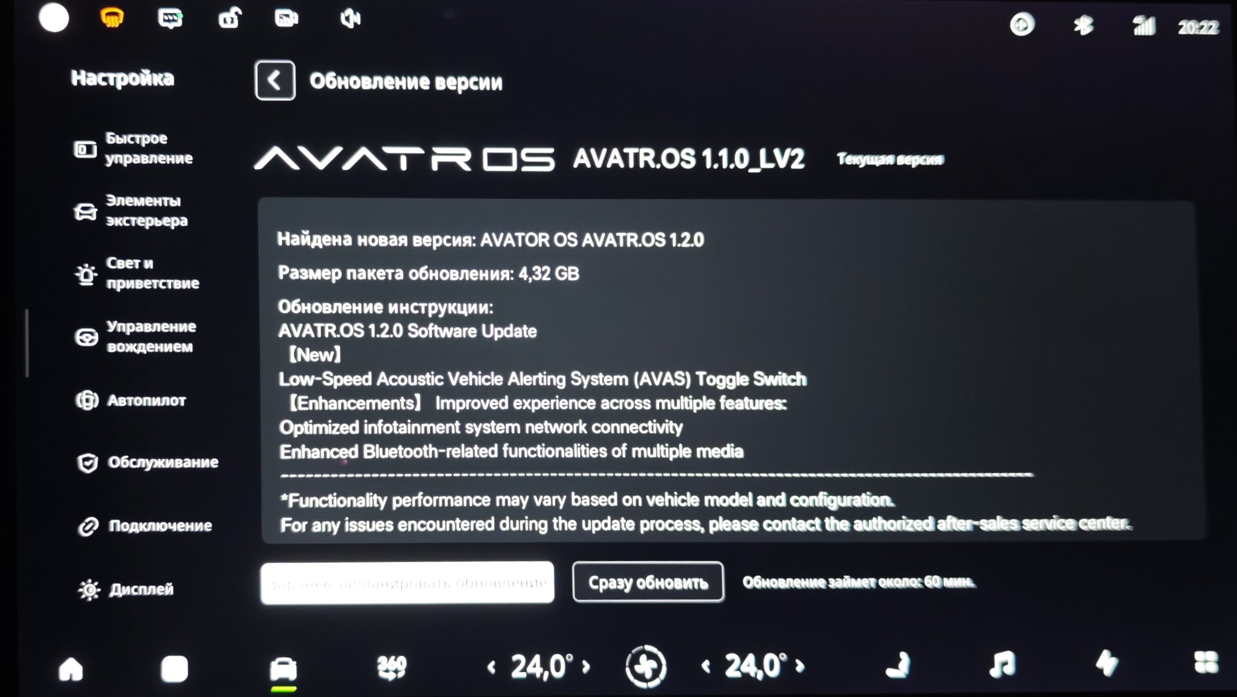 В процессе тестирования Avatr 11 нам выпала возможность установить обновление ПО до версии 1.2.0 (OTA — over-the-air, интересно, что обозначается ОС в детальном описании как AVATOR OS).