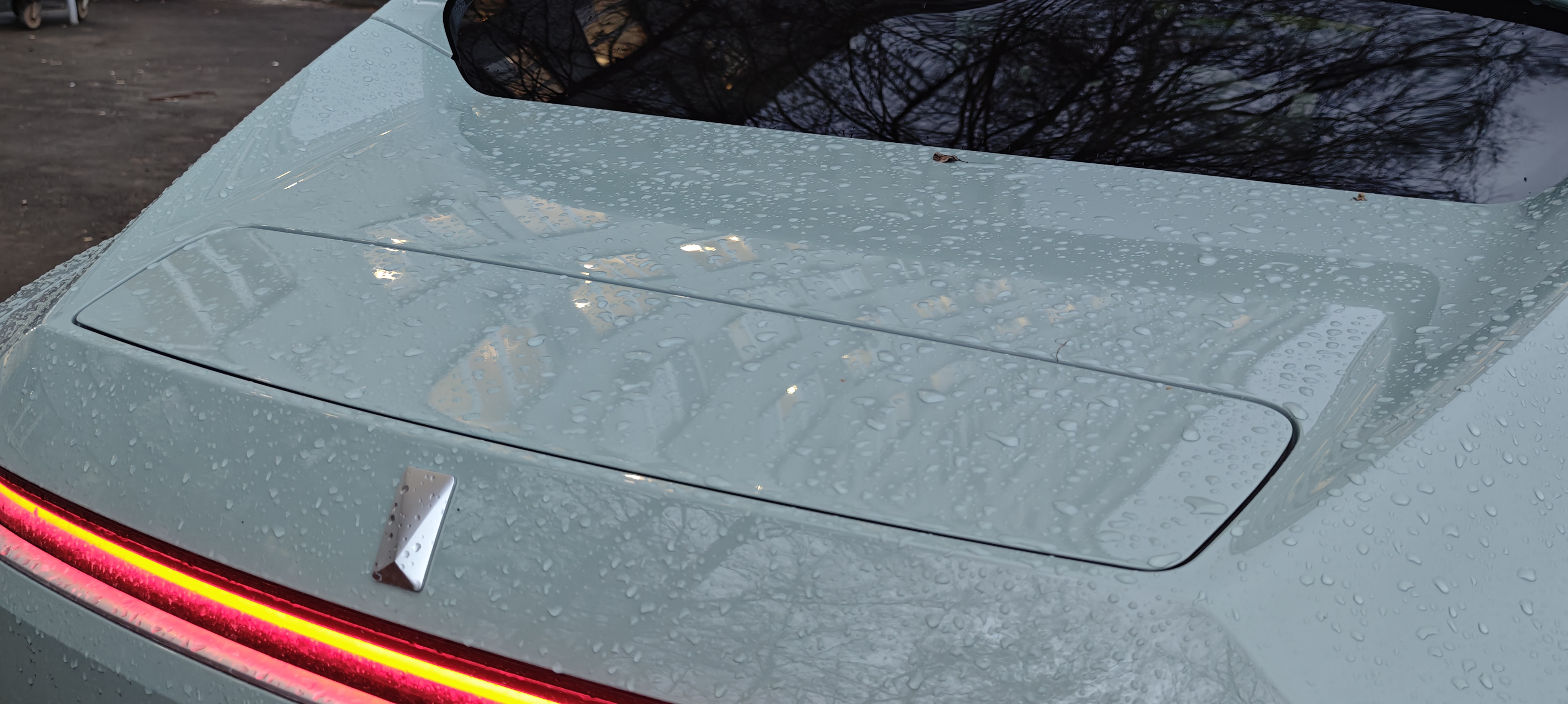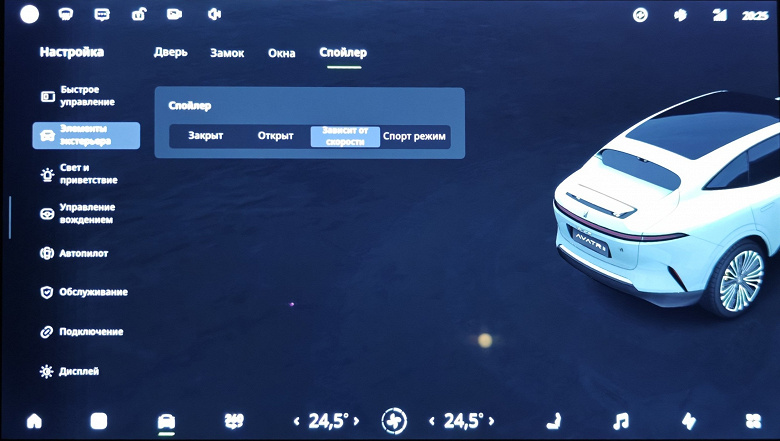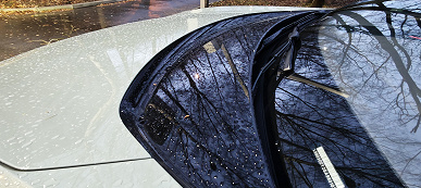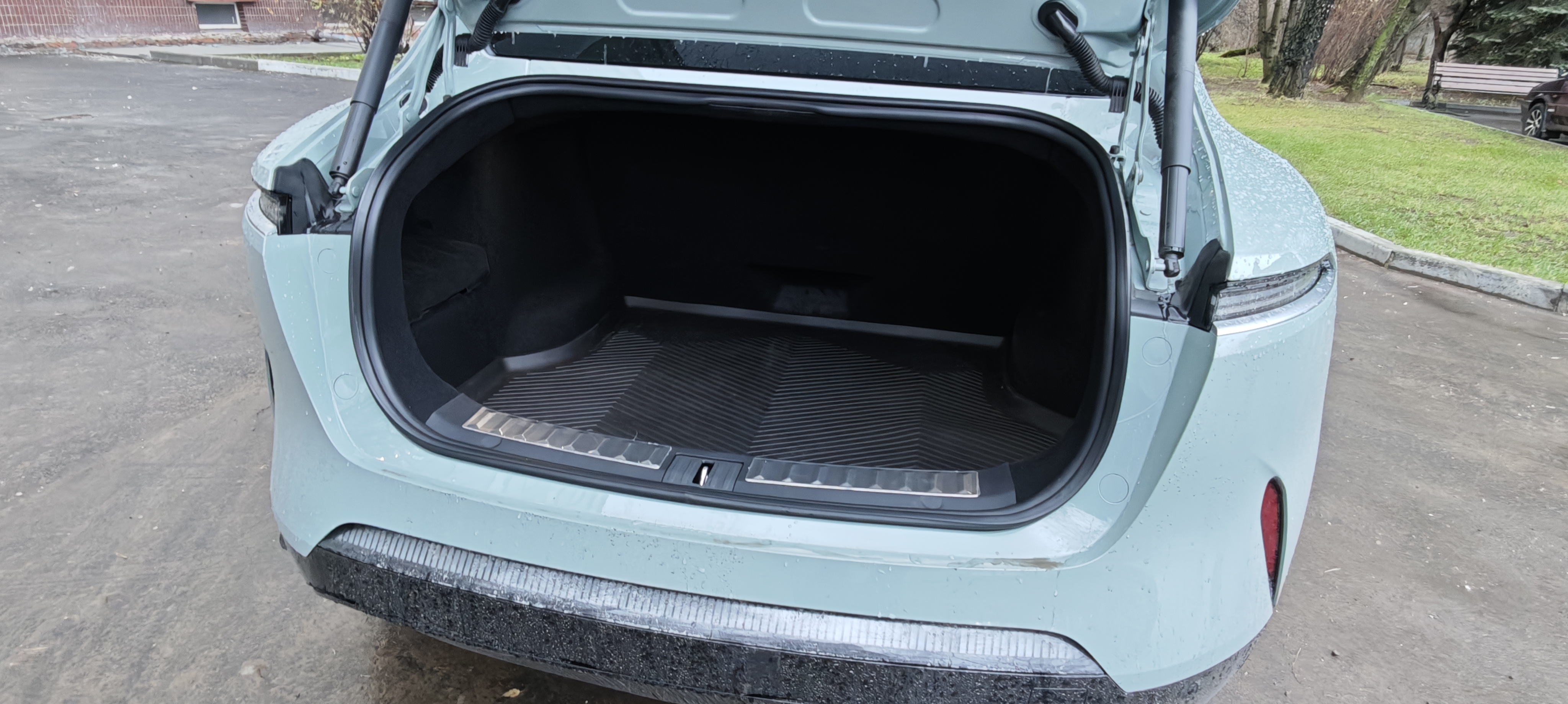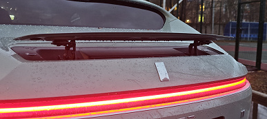 В убранном положении он полностью скрыт в кромке багажника, сохраняя чистые линии кузова и минимальное сопротивление воздуха на низких скоростях. Кроме того, спойлер можно поднять или опустить вручную через меню центрального дисплея — это удобно для демонстрации или в определённых режимах вождения.