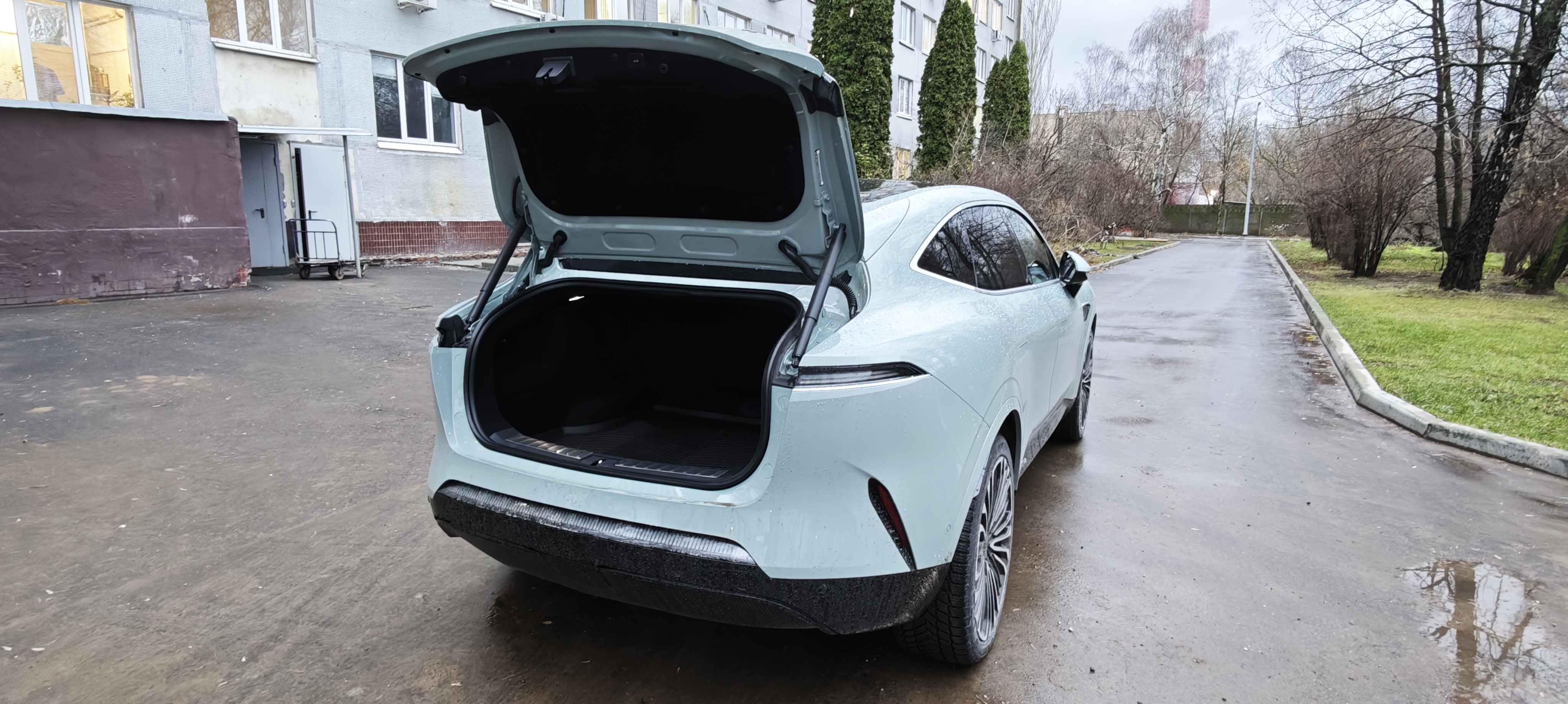 Задний багажник Avatr 11, повторюсь, имеет объём около 394 литров в стандартном положении, что типично для купеобразных кроссоверов с покатой крышей — он не рекордный, но достаточен для повседневных нужд: нескольких чемоданов, сумок с покупками или спортивного инвентаря. Крышка багажника открывается электроприводом (с кнопки, ключа или жестом ноги под бампером), проём широкий, но погрузочная высота относительно высокая из-за дизайна фастбэка, а заднее стекло неподвижное (не лифтбек).