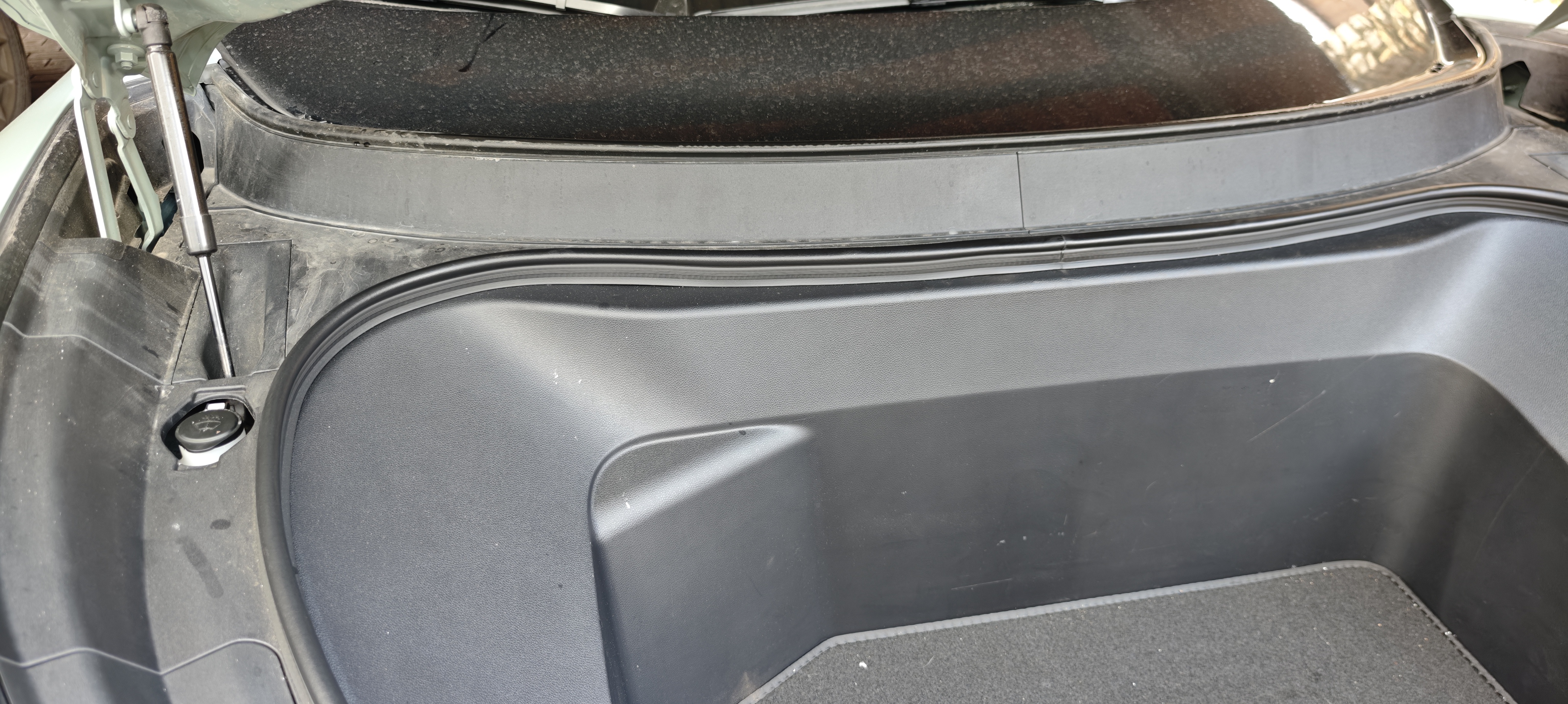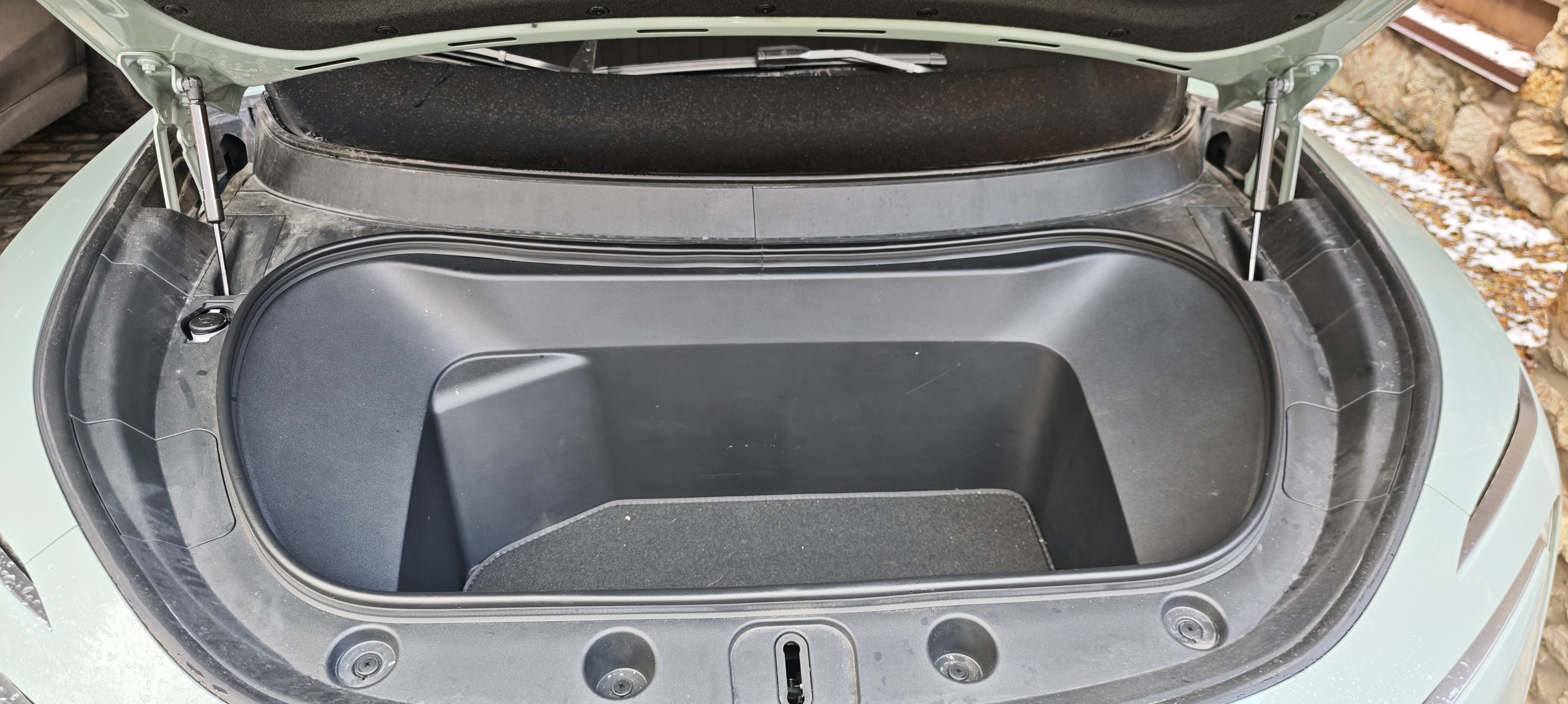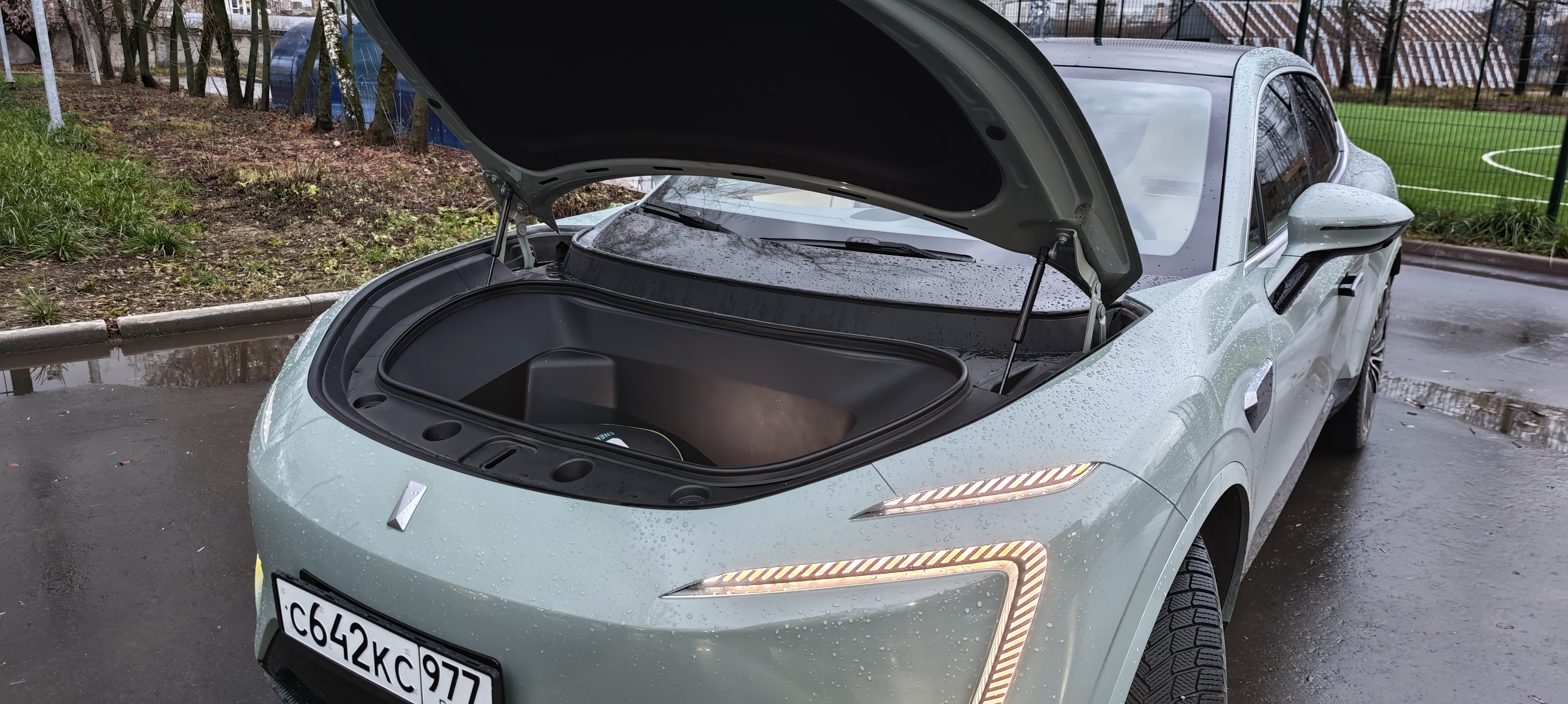 Франк открывается электроприводом (с кнопки в салоне, с ключа или через приложение), крышка поднимается вверх, обеспечивая удобный доступ. Отсек имеет пластиковую отделку, легко моется, оснащён дренажным отверстием для слива воды и подходит для хранения зарядных кабелей, мелких вещей, продуктов (чтобы не пачкать основной багажник) или мокрых/грязных предметов.