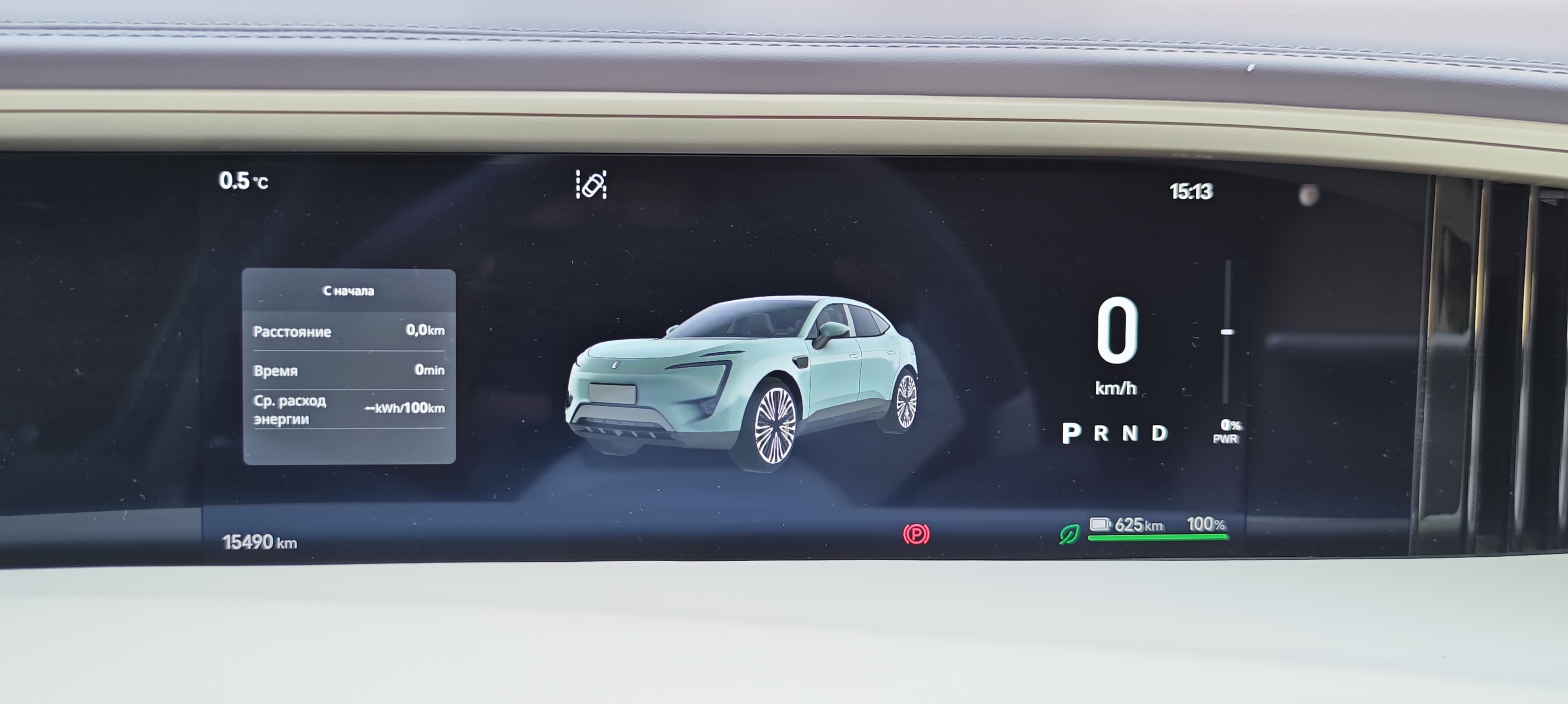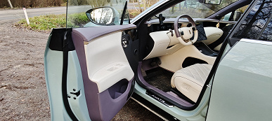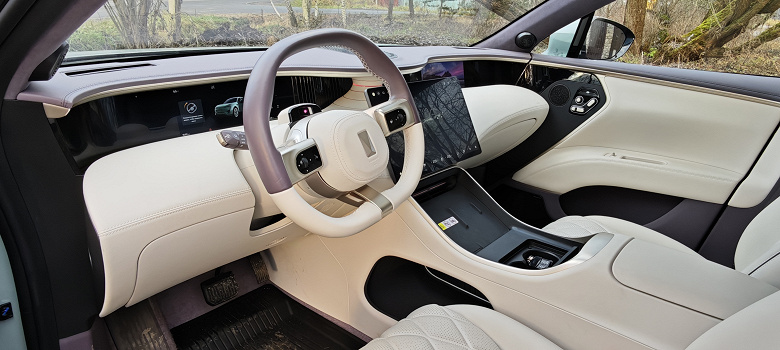 Вместо традиционной приборной панели здесь небольшой 10,25-дюймовый цифровой щиток прямо перед водителем — компактный, с отличной чёткой графикой, отображающий скорость, запас хода, навигацию и ассистентов. Он не перегружен информацией, всё лаконично и читаемо даже на ярком солнце.