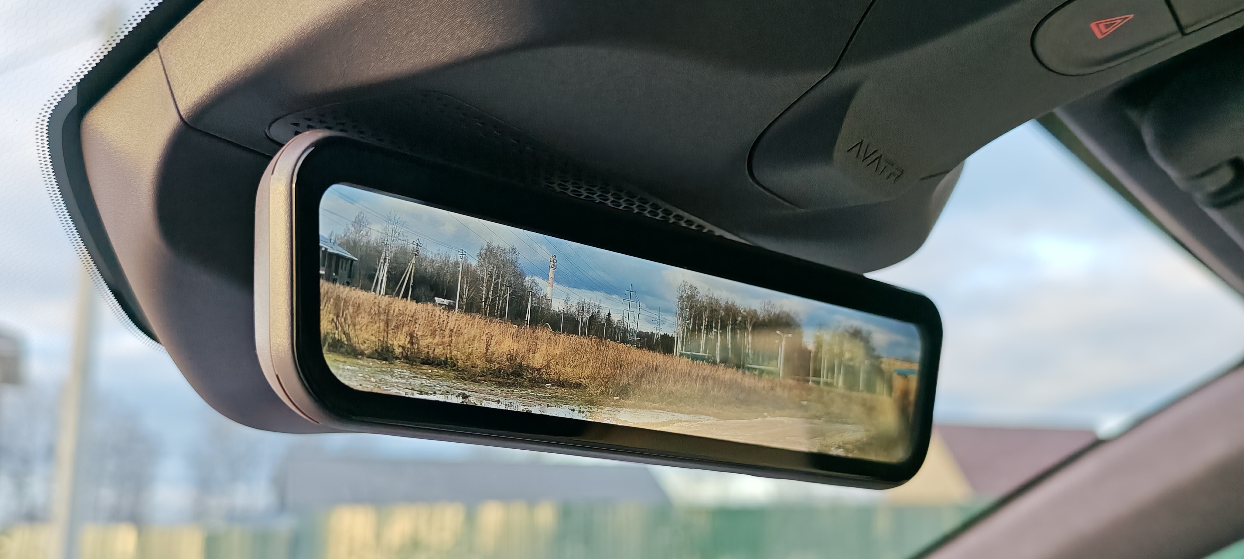 Салонное зеркало заднего вида в Avatr 11 реализовано в виде экрана, на который транслируется изображение с отдельной камеры, расположенной в задней части кузова под спойлером. Это решение лучше подходит для купеобразного фастбэк-кузова с покатой крышей и минимальным задним стеклом («бойницей»), где традиционное зеркало было бы бесполезным.