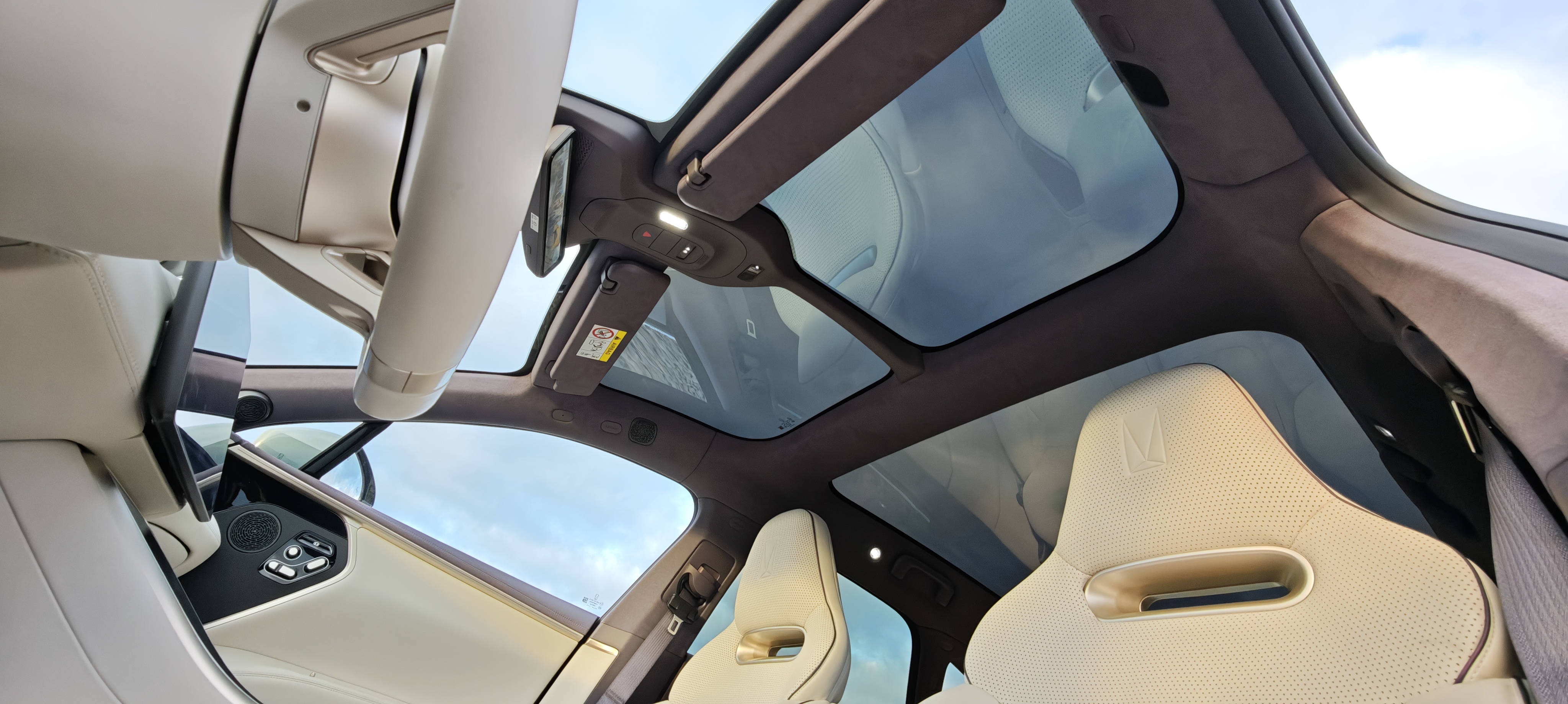 Панорамная крыша в Avatr 11 представляет собой фиксированную стеклянную панель огромной площади, которая тянется от лобового стекла почти до заднего спойлера, создавая эффект «парящего» салона и усиливает ощущение открытости пространства.