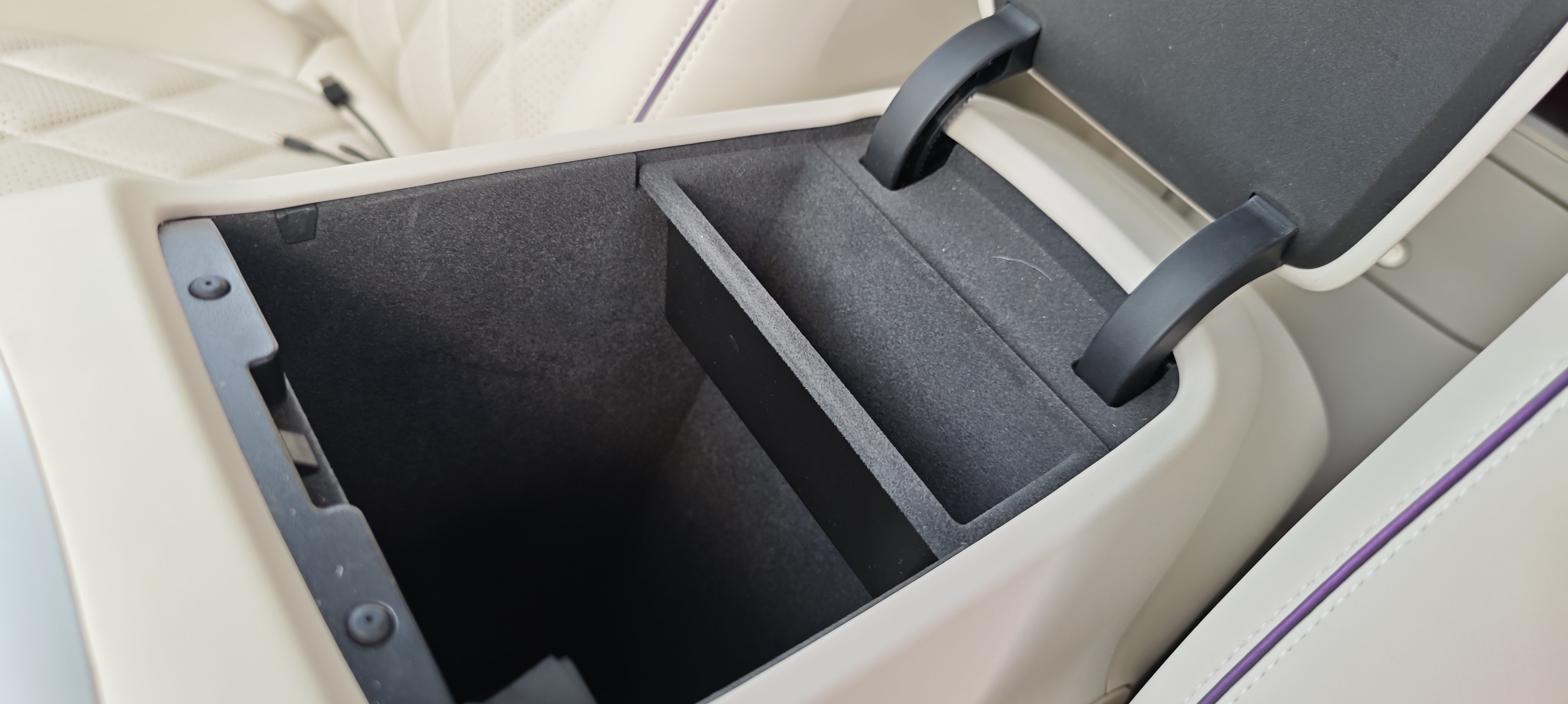 Внутри консоли находится большой закрытый отсек для хранения — глубокий и вместительный, с мягкой отделкой, разделённый на несколько секций. Он предназначен для мелочей: бутылок с водой, гаджетов, документов, косметики, очков, зарядных кабелей или личных вещей, которые хочется скрыть от посторонних глаз.