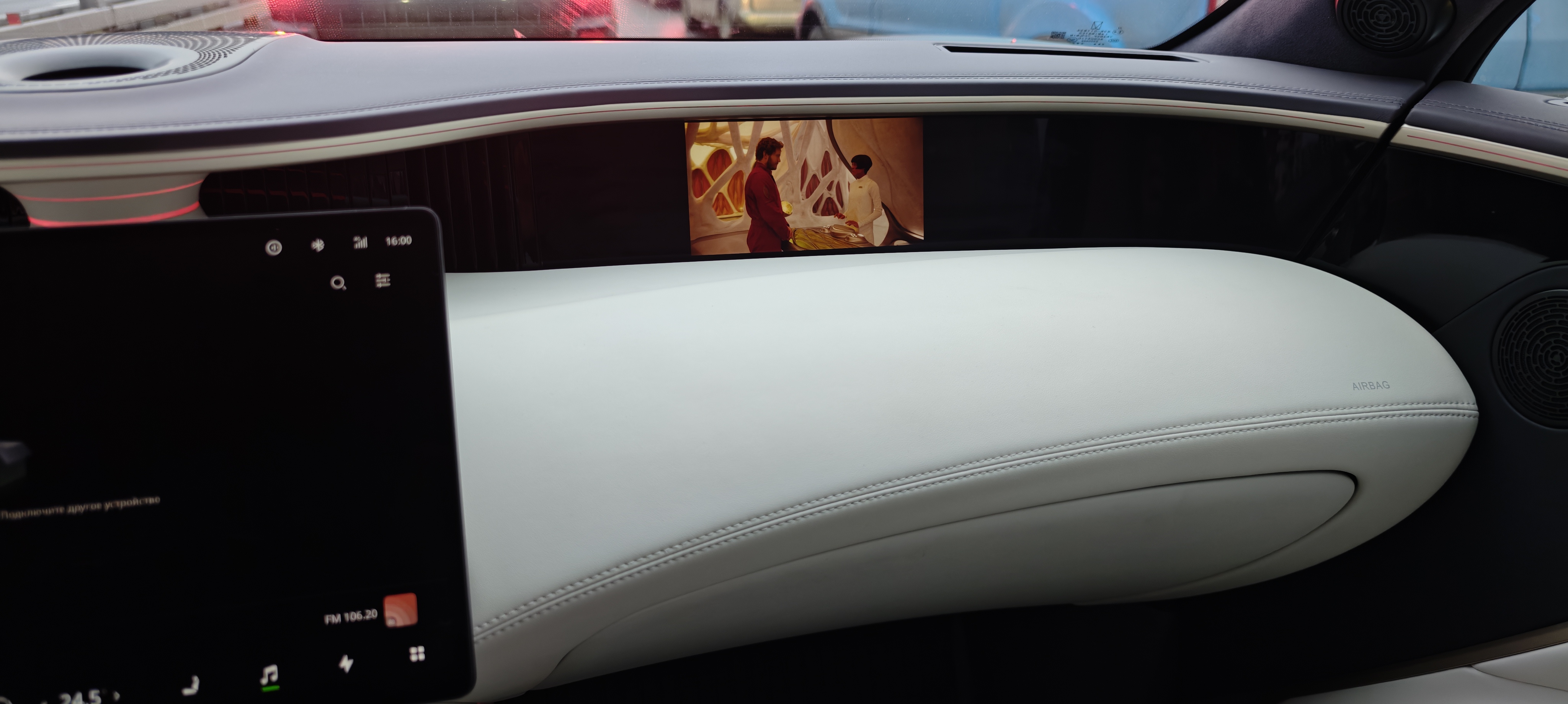Важно отметить, что во время движения видео доступно только переднему пассажиру (экран блокирует воспроизведение для водителя на большом экране из соображений безопасности — появляется предупреждение). Когда автомобиль стоит (режим «P» или «ручник»), видео можно смотреть и водителю. Задние пассажиры в четырёхместной версии могут дублировать изображение на свои экраны (если установлена опция кресел с задними мониторами).