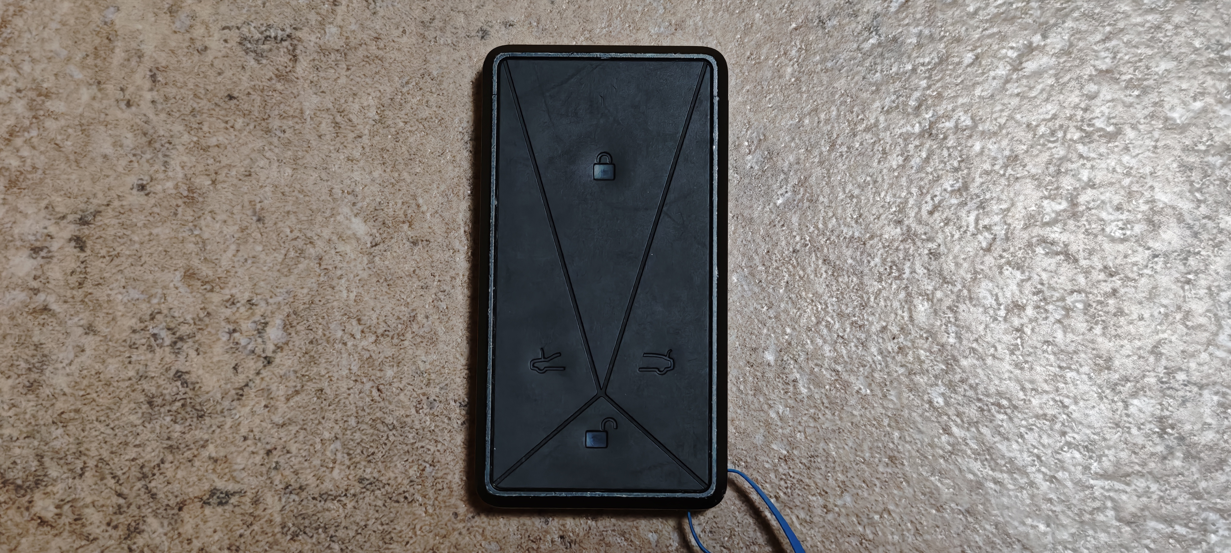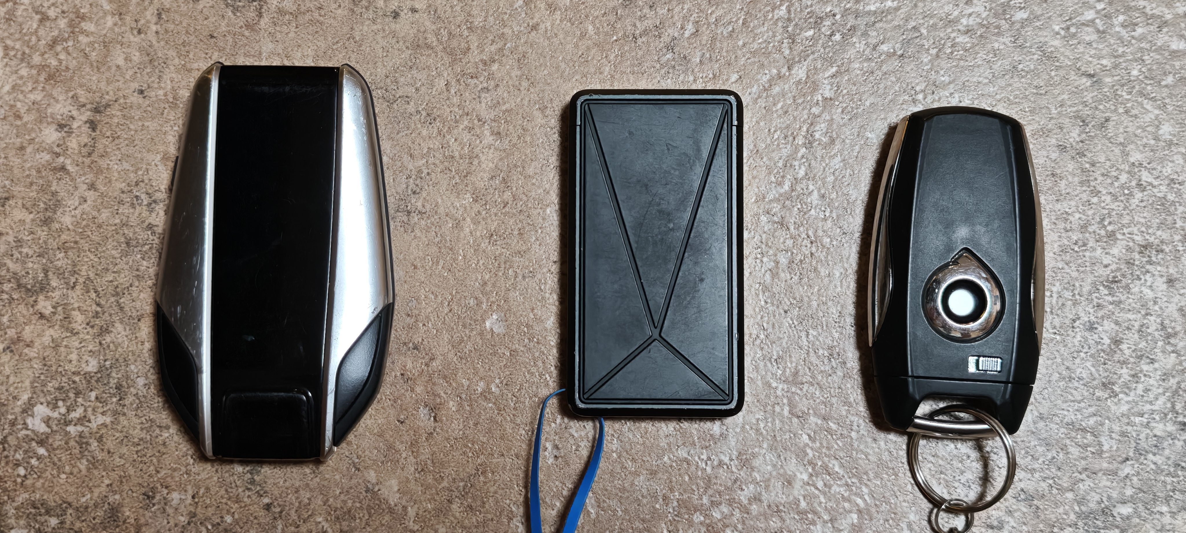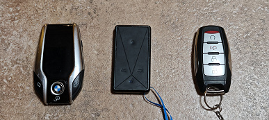 Ключ от Avatr 11 (средний на фото) — это плоский «брусочек» в минималистичном дизайне: чёрный пластик с геометрическим узором в форме «X», иконками замка/разблокировки.