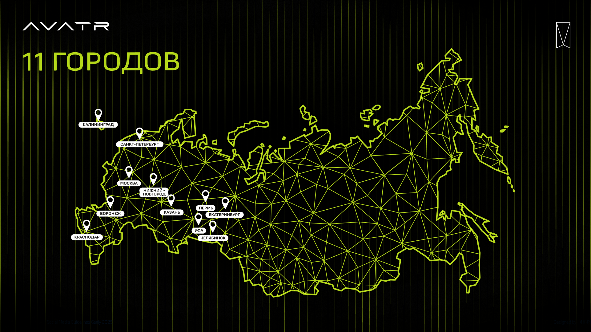 На конец 2025 года дилерская сеть Avatr в России продолжила активно расширяться: по данным на середину года, насчитывалось около двадцати центров в 11 городах (Москва, Санкт-Петербург, Краснодар, Казань, Нижний Новгород, Пермь, Воронеж, Калининград, Уфа и другие), с планами дальнейшего роста.