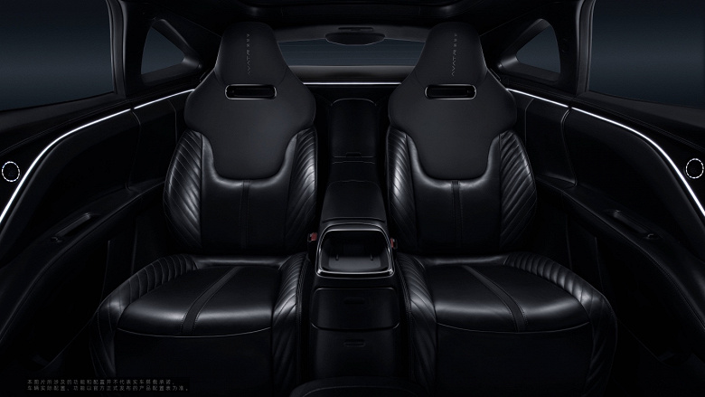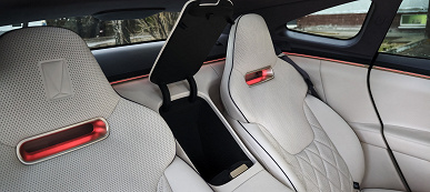Четырёхместная версия Avatr 11 ориентирована на максимальный комфорт для четырёх пассажиров: вместо традиционного дивана сзади установлены два отдельных кресла с широкой консолью между ними, чтобы создать атмосферу бизнес-класса или люксового купе.