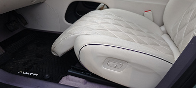 Сиденья — один из главных козырей электромобиля: эргономичные ковши с выраженной боковой поддержкой, обшитые мягкой перфорированной кожей, с электрорегулировками (до 12–18 направлений спереди), подогревом, вентиляцией и массажем.