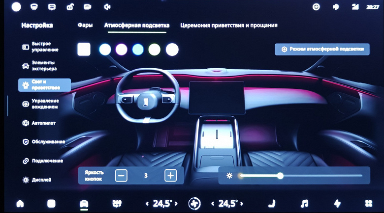 Интерьерная подсветка — многоцветная атмосферная (до 64 или 128 цветов на выбор), с плавной регулировкой яркости и режимами (включая синхронизацию с музыкой или режимами вождения).