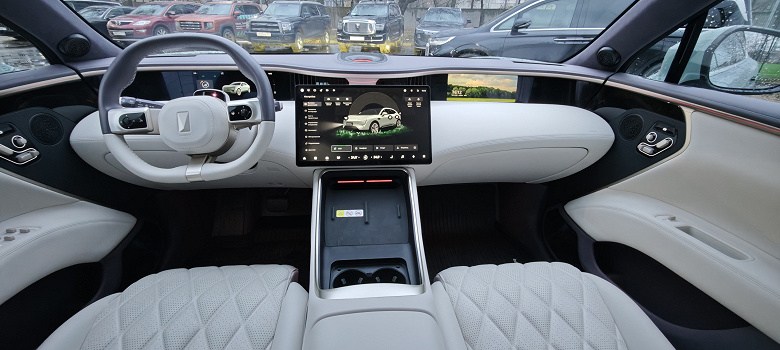 По центру торпедо доминирует большой 15,6-дюймовый сенсорный экран мультимедийной системы на базе HarmonyOS от Huawei: быстрый, с высоким разрешением, поддержкой голосового управления, навигации, Apple CarPlay/Android Auto (в российских версиях) и множеством приложений. Экран слегка повёрнут к водителю, управление интуитивное, но почти все функции вынесены сюда — физических кнопок минимум.