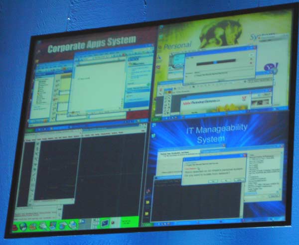 В ходе демонстрации технологии было представлено рабочее место инженера, система которого была «разделена» на четыре изолированных друг от друга «виртуальных компьютера», на каждом из которых выполнялись свои, независимые задачи.
