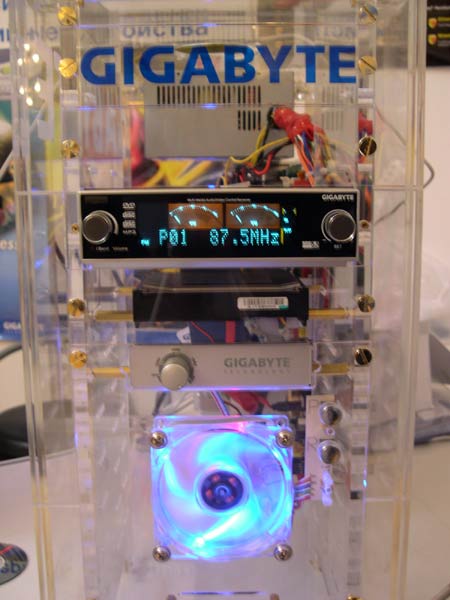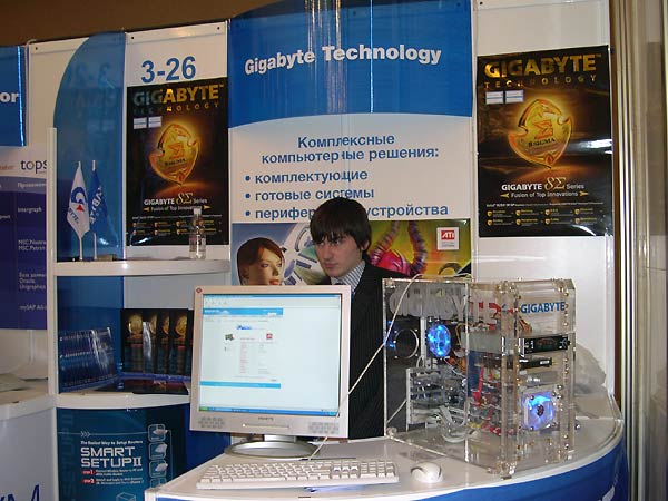 Привлекал внимание прозрачный корпус ПК с встроенным DVD-ROM с FM-тюнером, а также ЖК-монитор Gigabyte, поставки которых на российский рынок осуществляются пока только мелкими партиями.