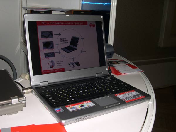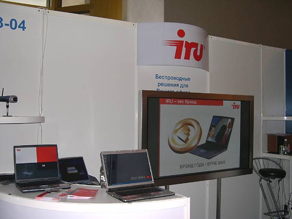 Стенд iRU был посвящен беспроводным решениям для офиса. На полках развернувшейся экспозиции можно было увидеть ноутбук Stilo 6154, появление которого в продаже ожидается в течение ближайших двух недель, а также образец модели Stilo 3841, которая поступит в продажу несколько позднее.
