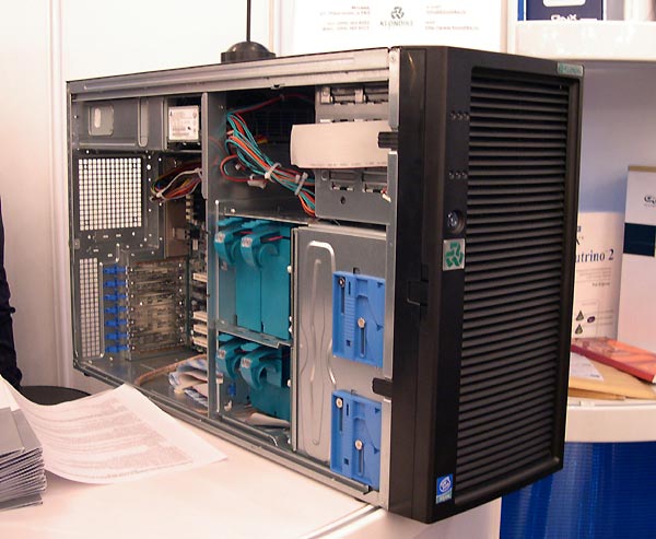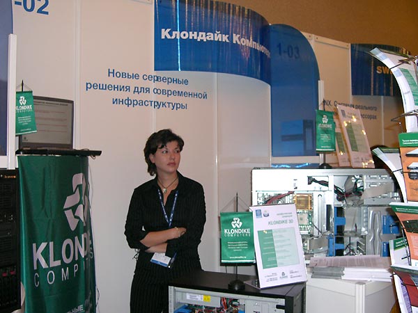 На стенде Klondike Computers демонстрировались обновленные на днях серверы KLONDIKE President 1500А и KLONDIKE President 2000, построенные на базе процессоров Intel Xeon нового поколения. Данные решения предназначены для рабочих групп, подразделений крупных компаний и небольших предприятий. Тактовая частота установленных процессоров может варьироваться от 2,8 до 3,6 ГГц, а объем кэша равен 1 Мбайт. Увеличившаяся пропускная способность системной шины, работающей на частоте 800 МГц, составила 6,4 Гбайт/сек. Обновленные серверы отличает 64-разрядное расширение EM64T и шина нового поколения PCI Express.