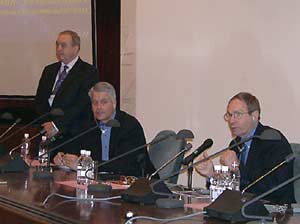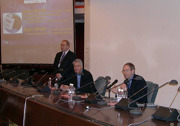 По окончании докладов участники Форума разработчиков отправились на тематические сессии, а представители СМИ — на пресс-конференцию, где можно было еще раз услышать о конвергенции компьютерных и телекоммуникационных технологий, беспроводных технологиях, развитии деятельности Intel на территории России, об ориентации на платформы, снижение энергопотребления, новых направлениях в области развития процессоров и новых технологиях Intel, а кроме того, задать вопросы принимавшим участие в конференции Фрэнку Спиндлеру и Ричарду Вирту, а также Александру Палладину, директору пресс-службы российского представительства компании Intel.