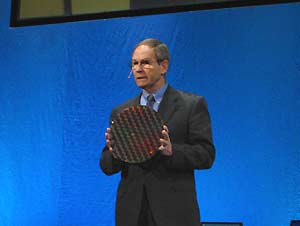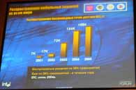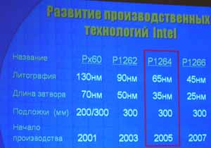 Не остались без внимания на Форуме и новые технологические процессы, которые Intel планирует использовать в новых решениях, а также использование 300-мм подложек при производстве процессоров. К настоящему моменту, согласно представленным данным, компания «серийно» использует 90-нм техпроцесс на трех 300-мм фабриках: D1G — Хилсбро, Орегон, F11X — Альбукерке, Нью-Мексико, F24 — Лейкслип, Ирландия. Все заводы, как было указано, используют методику точного копирования — для достижения соответствующей производительности и эффективности.