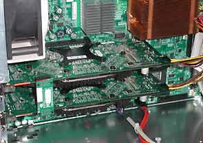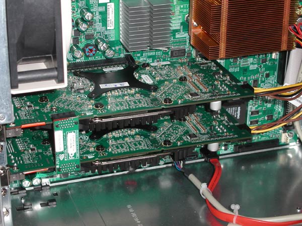 Кроме того, можно было увидеть демонстрацию технологии SLI. На фотографии справа — специальный соединитель-синхронизатор, который одевается на обе карты, вывод на монитор при этом ведется только с одной из плат (той, что ближе к CPU). Надеемся, что в самом ближайшем будущем эта система попадет в руки специалистам нашей тестовой лаборатории, и мы сможем поделиться с вами подробными данными о производительности демонстрируемого образца.