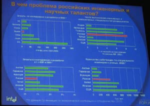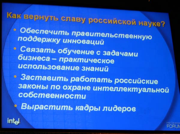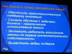 Отмечая наличие таких преимуществ, как традиционное стремление изобретать, наличие инфраструктуры для изобретений, высокий уровень образования в области естественных наук, рост индустрии российского ПО, президент Intel в России упомянул, что отечественной науке предстоит решить ряд проблем. Так, например, согласно приведенным в докладе данным, в России только 5% предприятий активно используют технологические инновации в бизнесе. Говоря о проблемах, докладчик сообщил, что сектор инноваций составляет менее 1% ВВП. Для решения проблем в первую очередь необходимо, чтобы инвестиции в новые разработки поддерживались на уровне макроэкономики, кроме того, необходимо создавать новые региональные центры технологических разработок и внедрения инноваций, решать проблемы защиты интеллектуальной собственности.