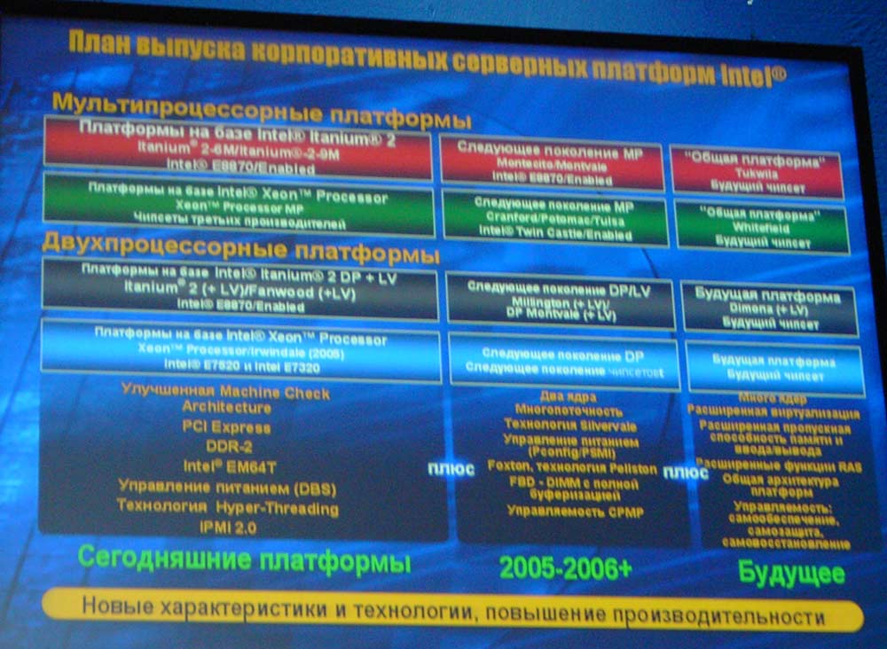 Напоследок приведем некое подобие списка «ключевых слов» этого Форума: конвергенция, беспроводные сети, мобилизация, современные серверные системы, повышение конкурентоспособности российских разработок и страны в целом, наложенные (оверлейные) сети, новые технологии — виртуализации серверов (Silvervale), активного управления процессорами (IAMT), расширение функциональности процессоров, параллелизм вычислений, 65 нм, многоядерные процессорные архитектуры, новые сетевые процессоры, снижение энергопотребления, модульные сети и др.