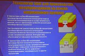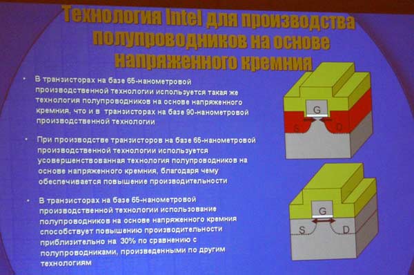 Был в докладе упомянут и 65-нм техпроцесс, рассматриваемый компанией как один из перспективных: во-первых, 1,2-нм затвор из оксида и 35-нм длина затвора способствуют повышению производительности решений, во-вторых, 220-нм расстояние между контактами затворами способствует повышению плотности. Использование же силицида никеля позволяет обеспечить создание затворов с низким сопротивлением и компонентов между стоком и истоком. Таким образом, усовершенствованная технология создания полупроводников на базе напряженного кремния способствует повышению производительности конечных решений.