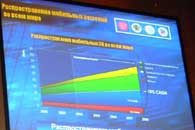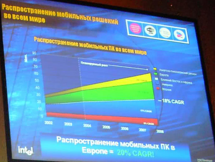 Г-н Дэвис привел довольно интересные данные, характеризующие распространение мобильных ПК во всем мире (по регионам — первый снимок), распространение точек доступа (второй снимок) и оценку развития IT-рынка России по секторам: ПО, аппаратура, услуги IT, коммуникационные услуги и голосовые коммуникации (третий снимок):