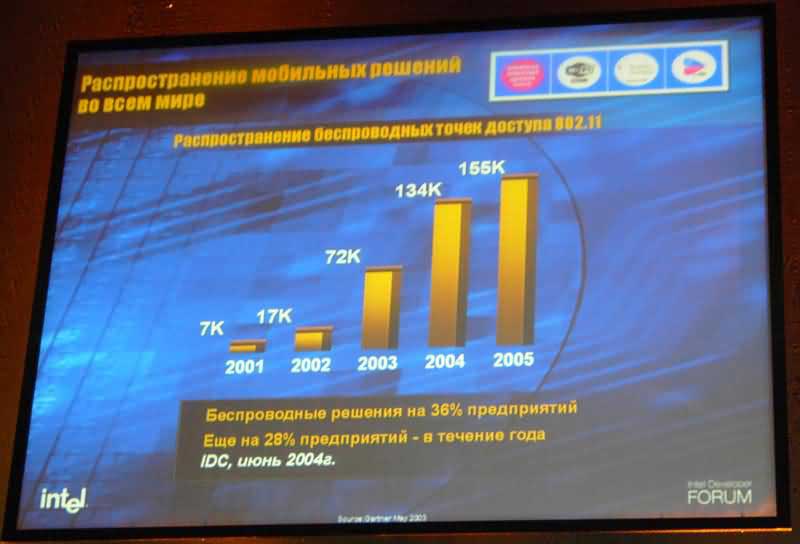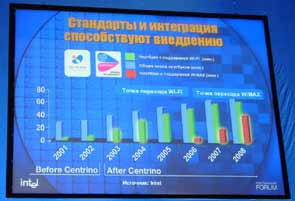 Беспроводная связь. Широкое внедрение беспроводных технологий уже не первый год является одним из важнейших направлений деятельности Intel. По мнению специалистов компании, беспроводные технологии идеально подходят для российских просторов, еще не опутанных проводами. За быстрым распространением беспроводных технологий в стране Intel видит хороший шанс сделать существенный рывок в социально-экономическом развитии.
