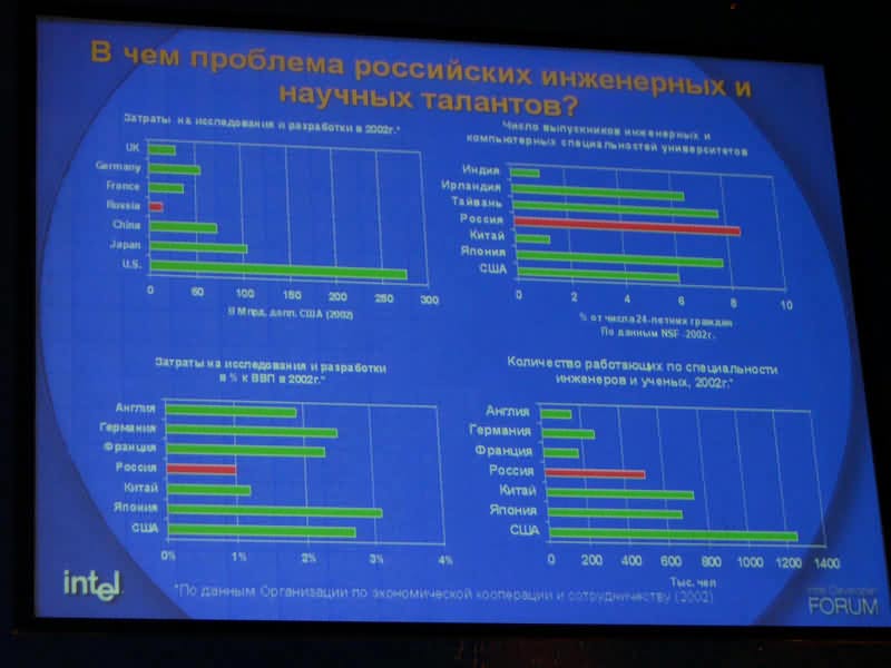 На данном этапе ведущую роль в ликвидации цифрового отставания, по его мнению, должны сыграть отечественные компании, обеспечивающие появление в стране соответствующей инфраструктуры. «Наращивание собственного производства конкурентоспособной компьютерной техники, перенос, благодаря сотрудничеству с ведущими компаниями и, прежде всего, с Intel, инновационных технологических достижений и новых концепций использования информационных технологий, открытие новых современных производственных предприятий, накопление экспертизы поможет России приблизиться к уровню развитых стран», — отметил докладчик.