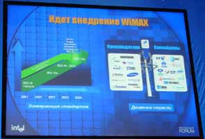 Как известно, в здании президиума Российской академии наук, где проводится Форум, ежегодно разворачивается публичная беспроводная локальная сеть стандарта 802.11b (Wi-Fi). Этой сетью уже никого не удивишь. Что же было нового? Этот Форум стал примечателен тем, что в его рамках впервые в России была организована публичная технологическая демонстрация системы стандарта 802.16а (WiMAX).