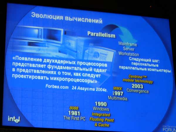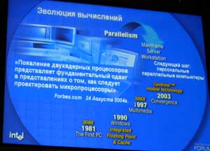 Часть доклада была посвящена многоядерным процессорам. Согласно представленным данным, по оценкам специалистов компании, в 2006 году более 40% настольных систем будут комплектоваться процессорами с двумя ядрами, в серверах количество систем с «двух- и более» ядерными процессорами составит более 85%, в мобильных системах показатель будет достигать более 70%.