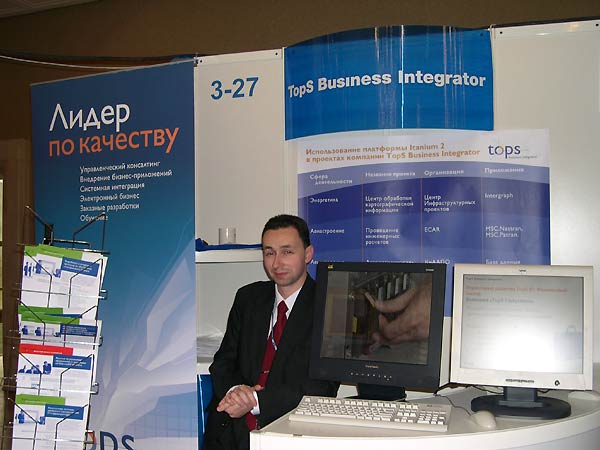 По соседству с Gigabyte разместился стенд TopS BI, где можно было получить информацию о деятельности компании, познакомиться с примерами использования технологий Intel в проектах по автоматизации важнейших бизнес-процессов предприятий в различных сферах бизнеса.