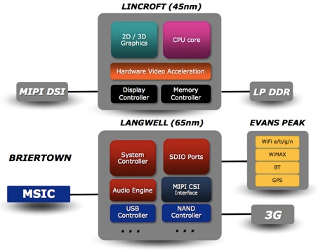 Состоит платформа из нескольких компонентов, в основе ее лежат: чип Intel Atom серии Z6xx (кодовое название Lincroft) и блок Platform Controller Hub (PCH) MP20 (кодовое название Langwell).