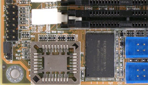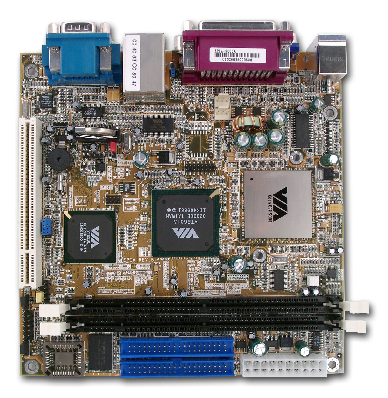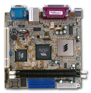 Вкратце повторюсь. Это безвентиляторное (с пассивным охлаждением) решение «все-в-одном». Плата собрана на чипсете VIA PLE133 (VT8601A), который обладает интегрированным графическим ядром AGP2x (на базе Trident Blade 3D), а так же южным мостом VT8231.