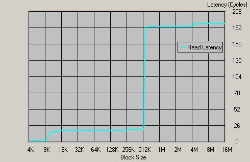 Мы видим 74 такта задержки, что соответствует приблизительно 45 нс!!! Это по-прежнему сравнимо со временем доступа к ячейке динамической памяти! Можно только выразить восхищение эффективностью такого решения, как встроенный контроллер памяти. Кстати, в текущей ситуации можно сравнить с задержками контроллера памяти процессора Opteron, который, как мы помним, использует Registered память (подчеркнем еще раз: наличие ECC при этом не обязательно!).