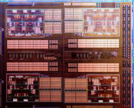 Bulldozer сначала выйдет на 32-нанометровом техпроцессе (и для нового разъёма AM3+, совместимого и с нынешними ЦП), но новая архитектура сделана на годы и поколения вперед (если только её не ждёт участь Pentium 4). Выше показан примерный внешний вид чипа «первенца» — 4-модульного (8-ядерного) ЦП Orochi. Но не стоит детально всматриваться в поисках микроархитектурных секретов — хитрые ребята из AMD без стеснения заявили, что специально исказили снимок, чтобы потенциальный противник (и любопытный журналист) не узнал лишнего раньше времени. Ну, насчёт журналистов это мы ещё посмотрим! ;)