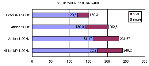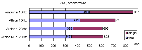 По результатам теста лидируют системы на процессорах AMD Athlon и Athlon MP частотой 1.2GHz. Также наблюдается отставание процессора Pentium III от Athlon той же частоты. Были проведены тесты и на более простых сценах, и расстановка участников в них аналогична описанной.